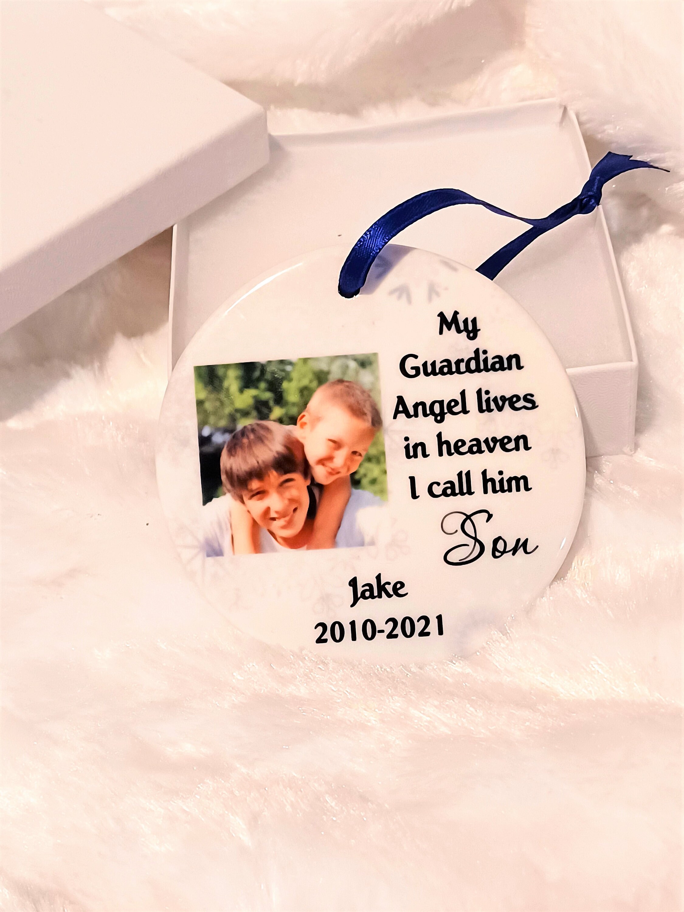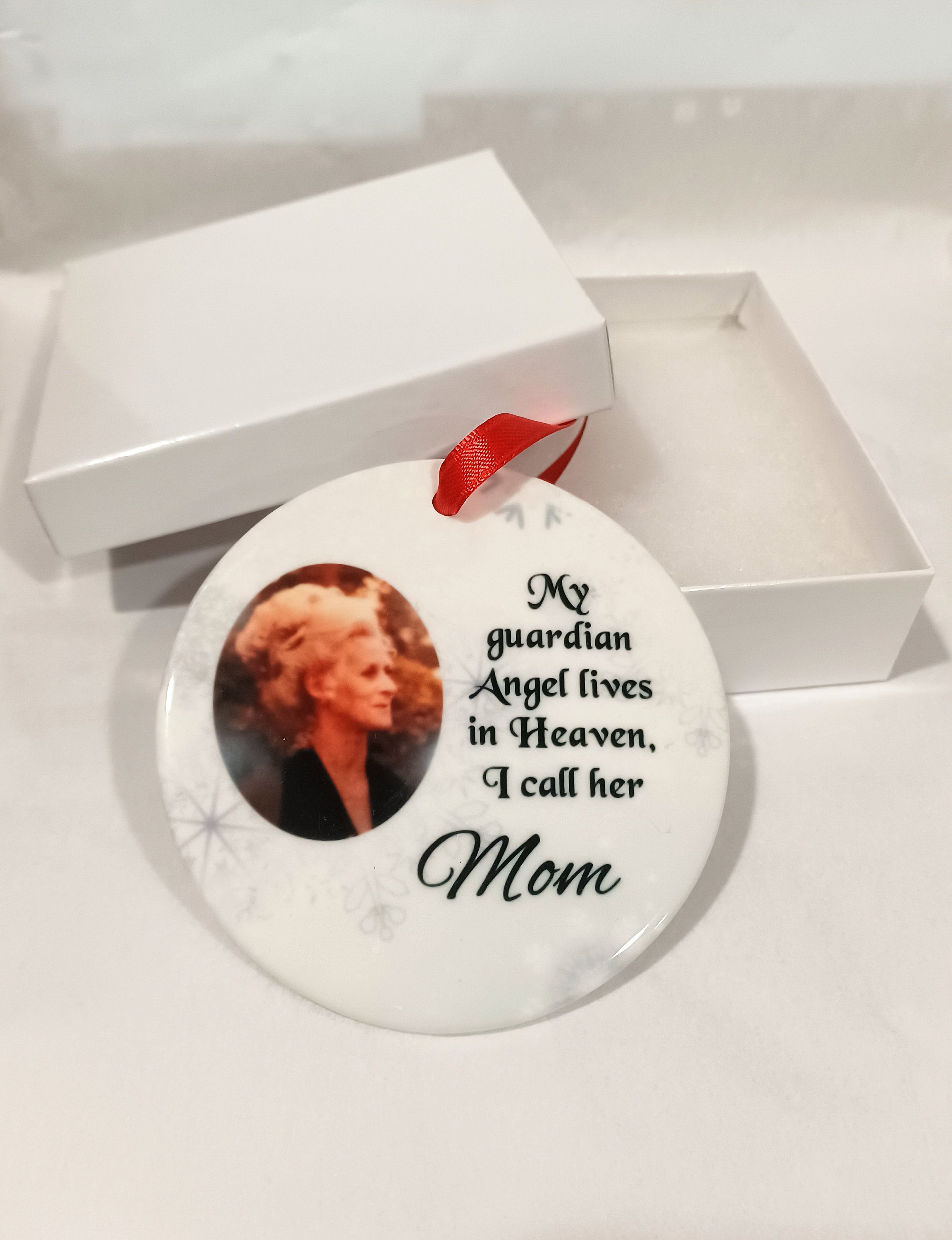 This heaven ornament comes with a gift box and we will do our best to get the color ribbon you would like.