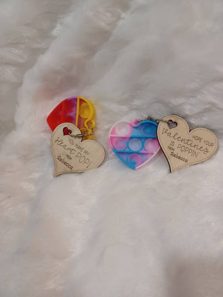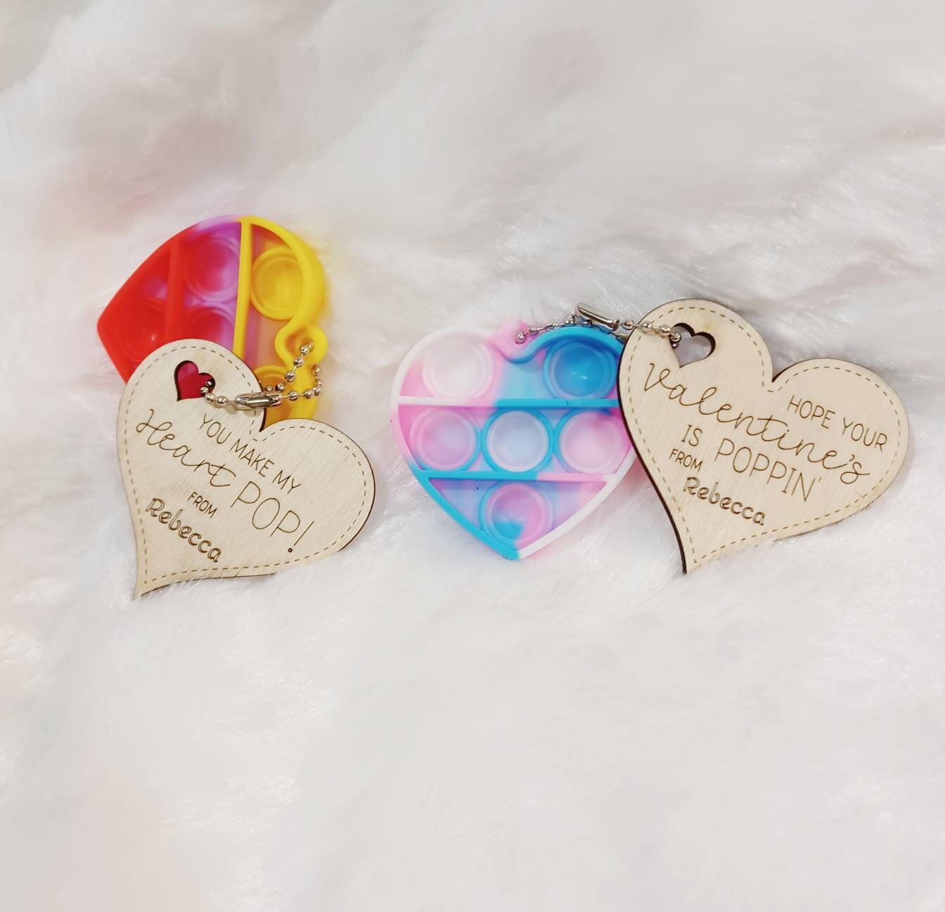 Multi-colored hearts with a personalized wooden tag on it. A great gift to make their heart pop this Valentine's Day! Your kids will be so excited to give these out!!