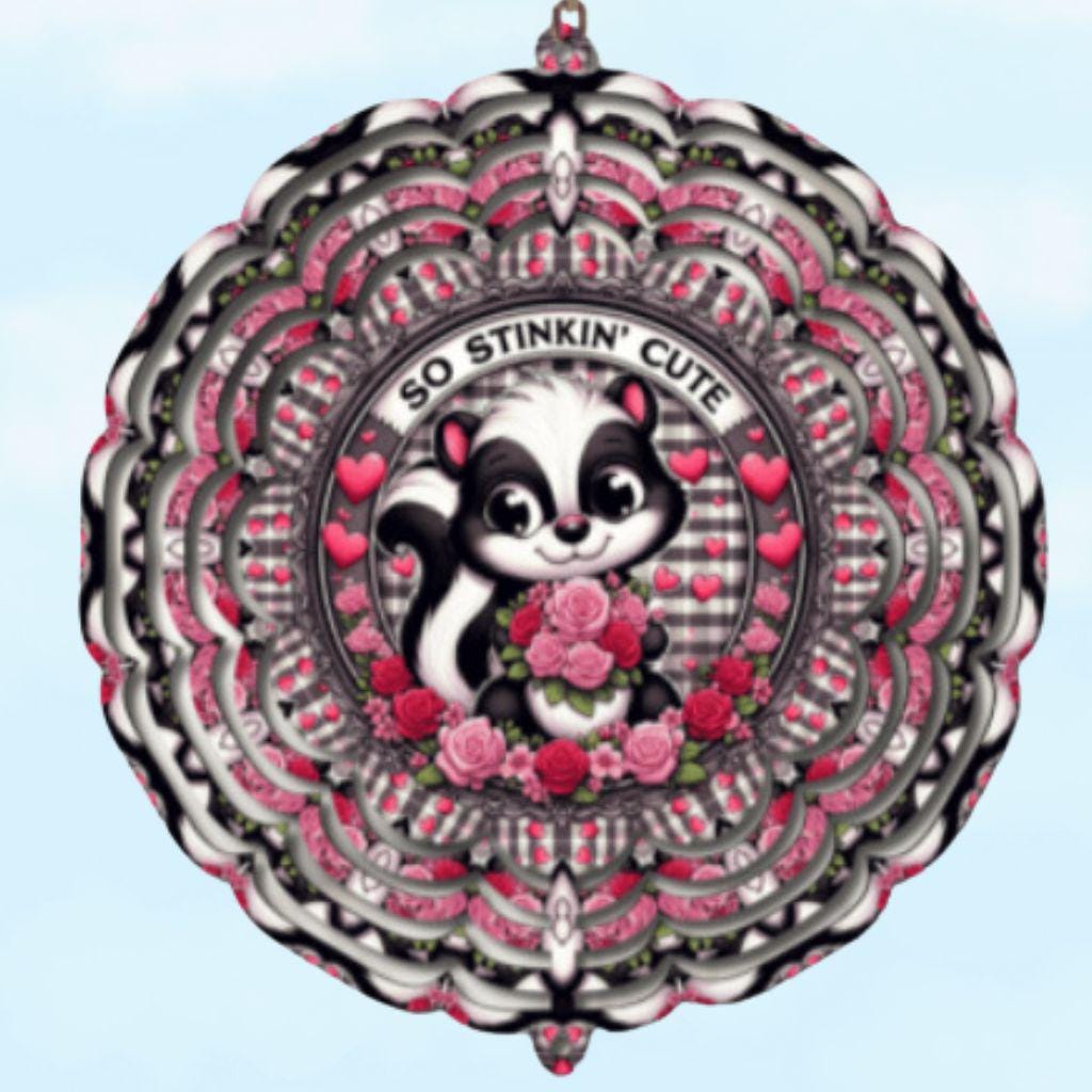 Add a playful touch to your Valentine’s Day decor with this adorable 10-inch wind spinner featuring a charming skunk and the phrase “So Stinkin’ Cute.” Perfect for celebrating love and whimsy, this wind spinner creates a delightful display of movement and color when it catches the breeze.