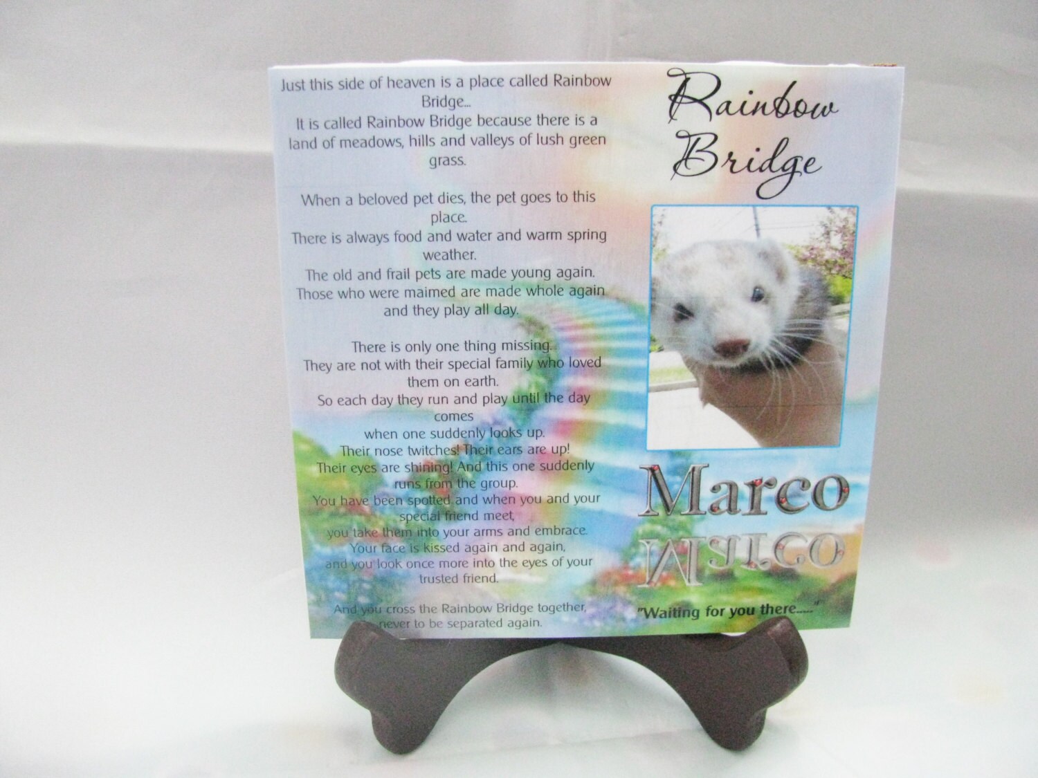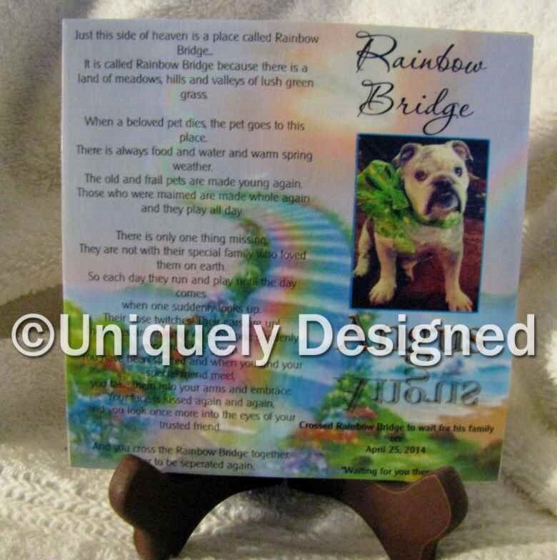 Our pet memorial tile is a 6x6 tile is a great way to remember that furry family member and forever friend. Whether you want the poem on this tile or another one (such as the Rainbow Bridge). We can customize this with your pet's picture and name to make it really special.