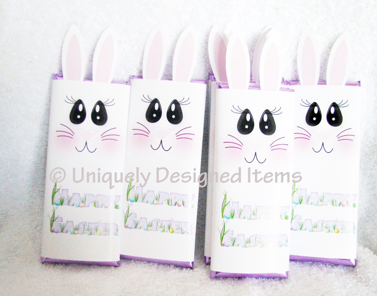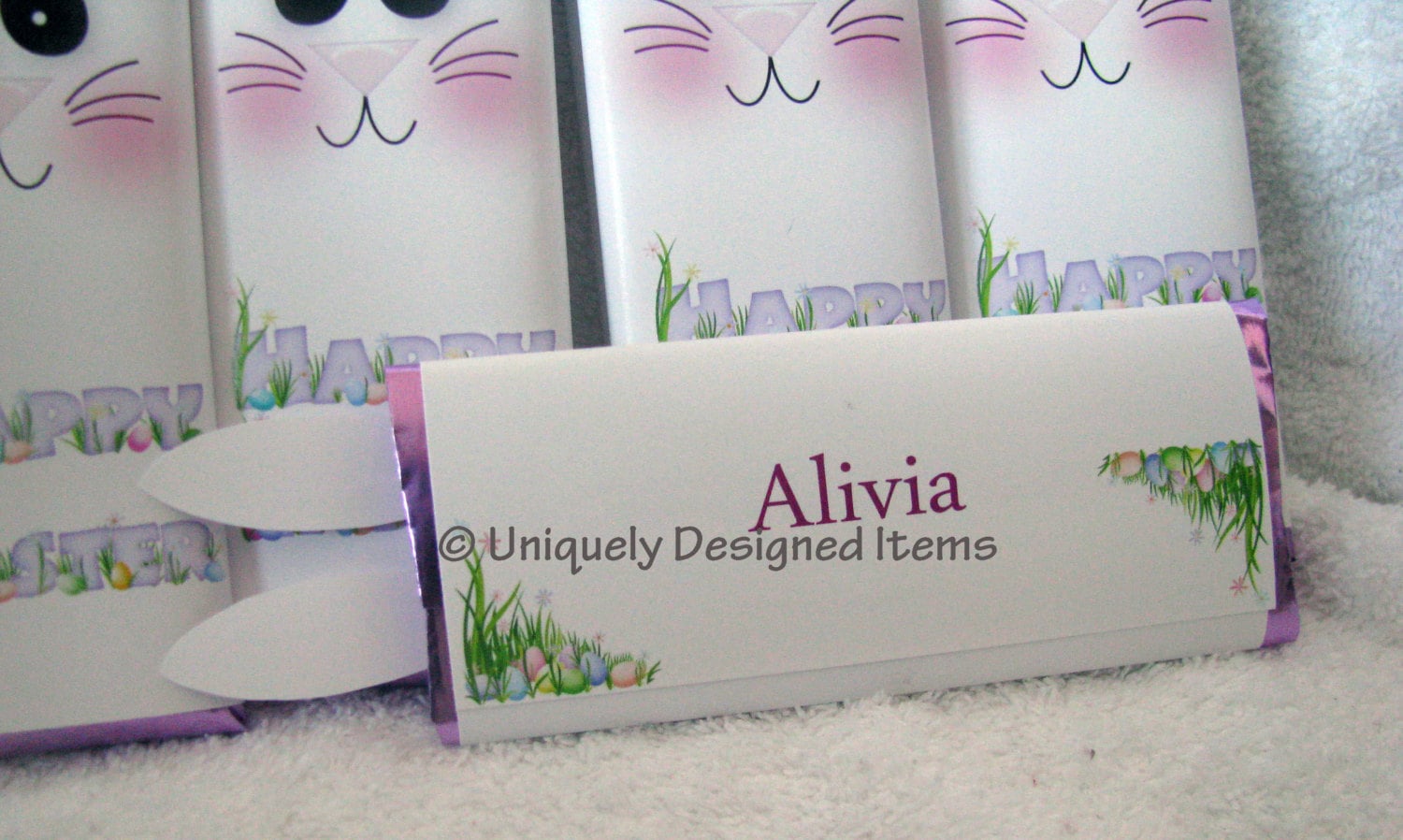 Extend the sweetest Easter greetings with personalized candy wrappers to tickle the fancy. A classic 1.55 oz Hershey bar wrapped up like the cutest little bunny you've ever seen! Your name added to the back puts the perfect finishing touch to your Easter candy gift. An ideal treat for your child's Easter basket or a kind gesture to all your family and friends, these chocolate bars are sure to be a hit.