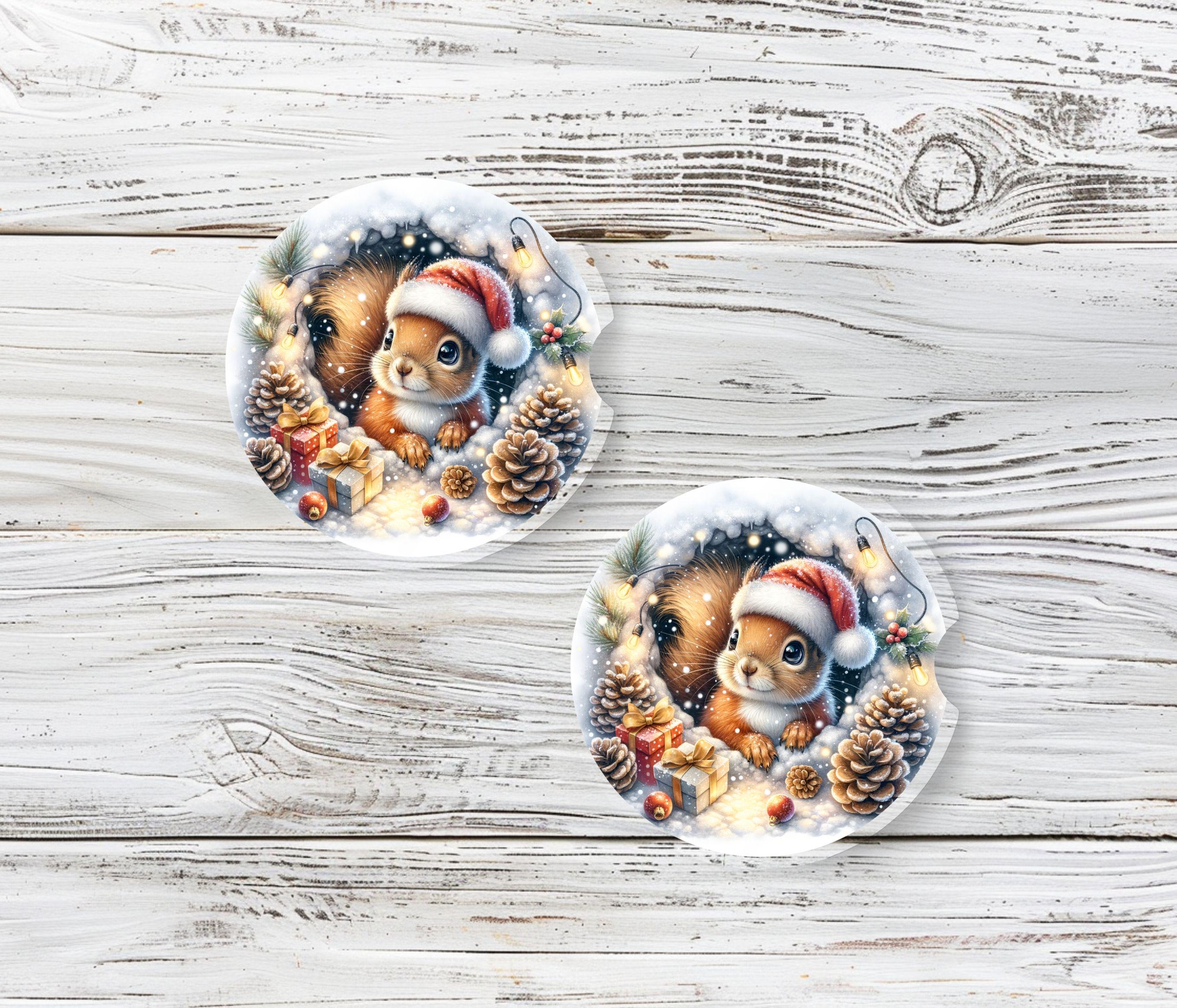 Add a dash of woodland charm to your holiday travels with these adorable squirrel car coasters! This festive pair features a sweet squirrel in a Santa hat surrounded by pinecones, presents, snowflakes, and glowing holiday lights—perfect for cozy Christmas vibes on the go.