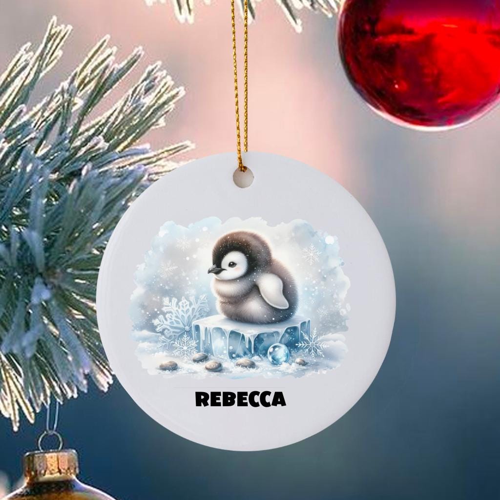 Add a touch of winter magic to your Christmas tree with this personalized penguin ornament. Featuring a sweet baby penguin sitting on an icy snowflake scene, this ceramic ornament is both whimsical and heartwarming. Customized with the name Rebecca (or your choice of name), it makes a charming keepsake for children, family members, or anyone who loves penguins and wintertime.