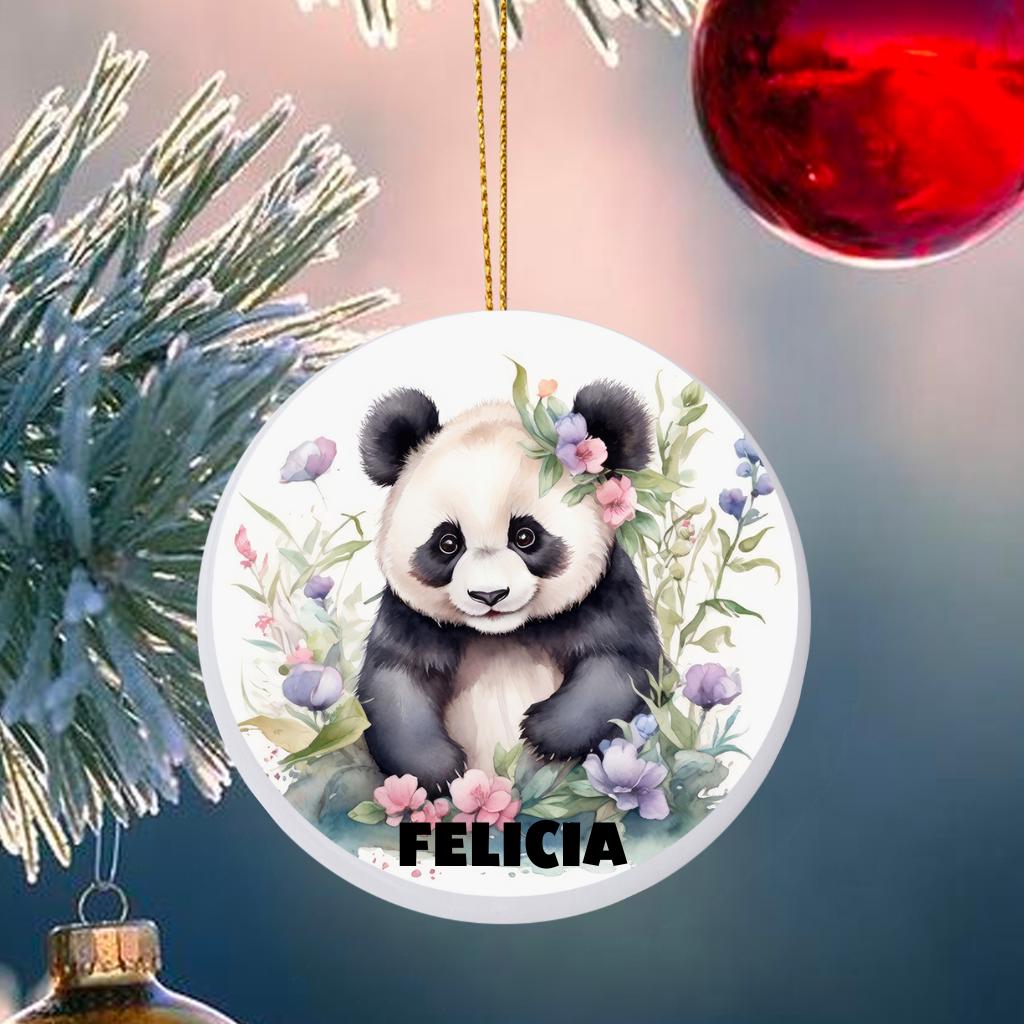 Add a touch of adorable charm to your Christmas tree with this personalized panda ornament! Featuring a cute watercolor-style panda surrounded by soft pastel flowers, this ornament makes a perfect keepsake for kids, animal lovers, or anyone who adores pandas. Personalize it with a name to create a one-of-a-kind holiday treasure.