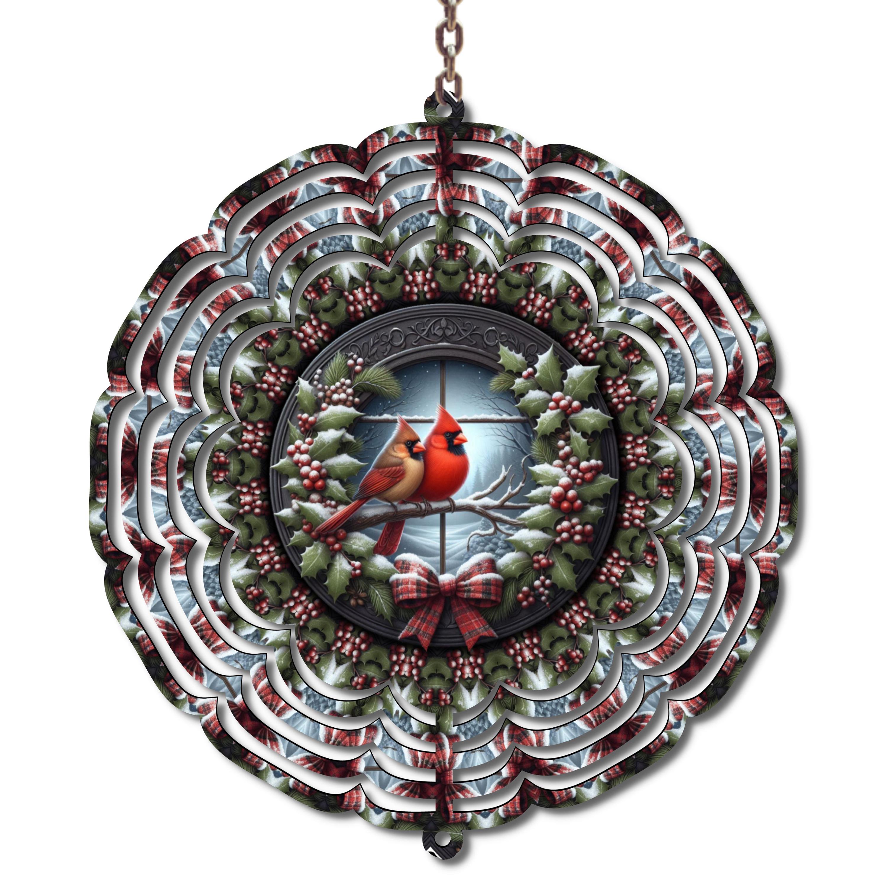 Bring the beauty of the season to life with this 10-inch metal wind spinner featuring a pair of red cardinals perched together on a snowy wreath. With layers of vivid red, green, and white that shimmer as it spins, this piece makes a heartfelt addition to your winter, Christmas, or memorial decor.