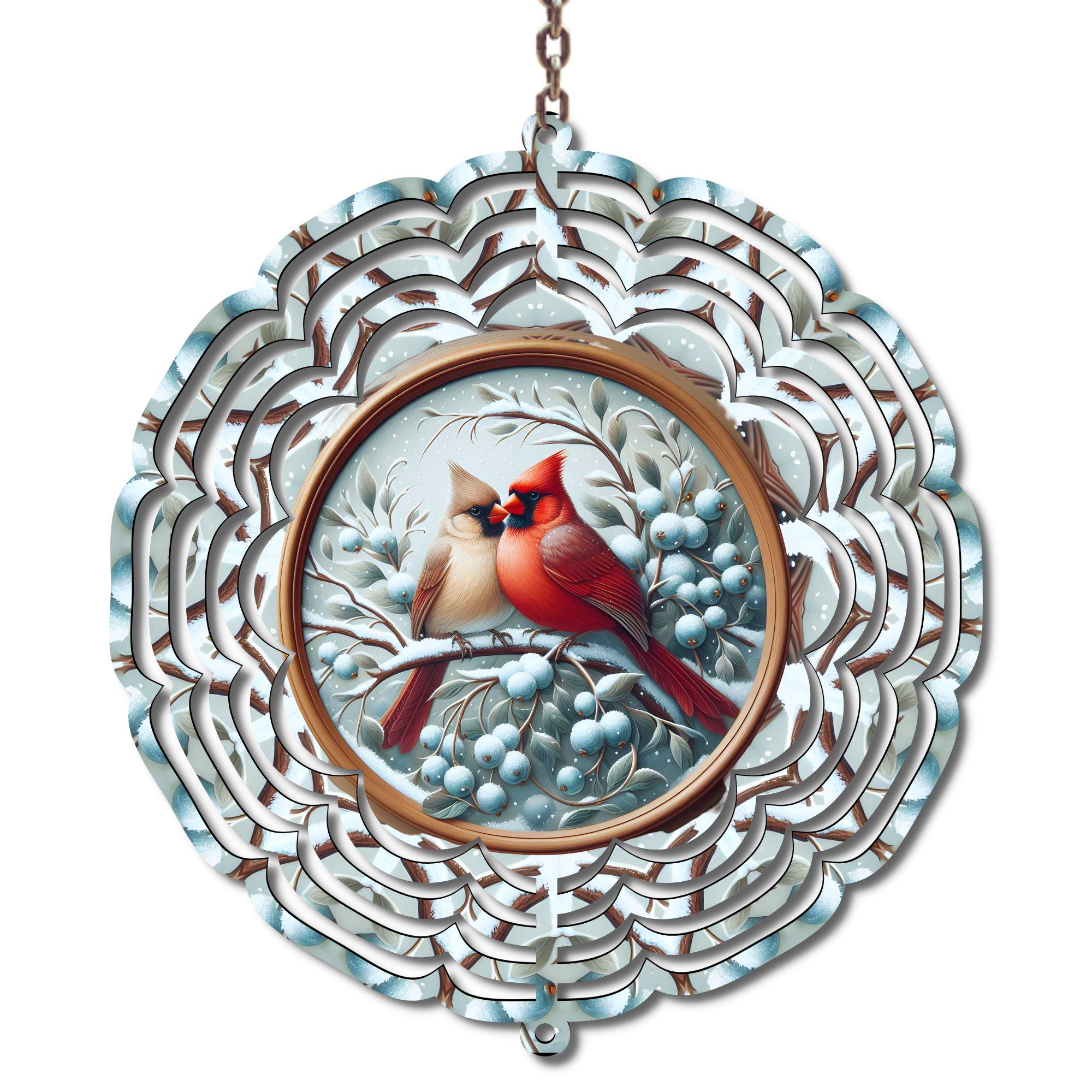 Add a touch of beauty and meaning to your home or garden with this 10-inch metal wind spinner, featuring a stunning pair of red and tan cardinals perched together on snowy branches. Surrounded by soft winter berries and delicate details, this piece captures both love and peace — a perfect reminder of togetherness and cherished memories.