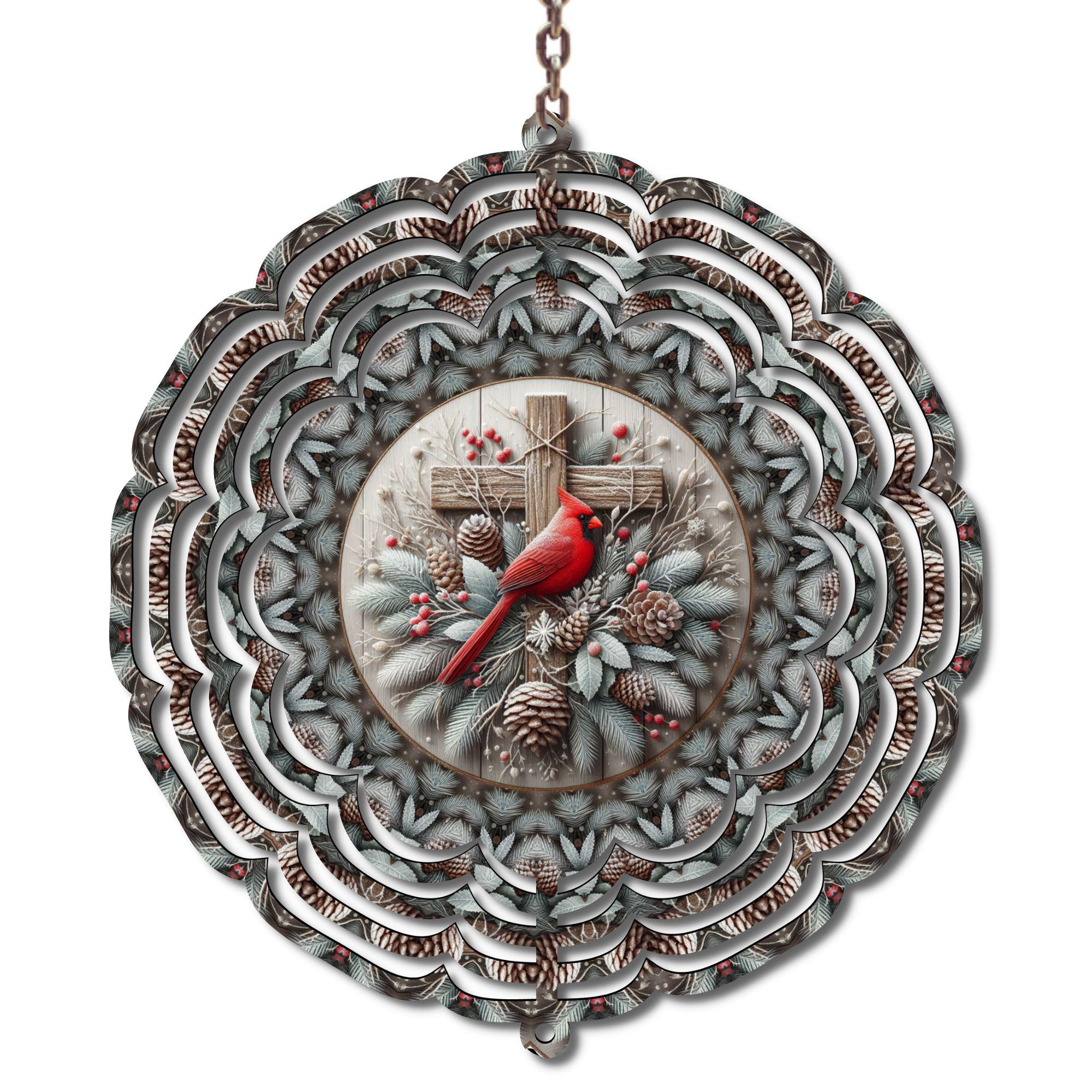 Bring peace and beauty to your home or garden with this 10-inch metal wind spinner, featuring a bright red cardinal perched on a branch beside a rustic wooden cross. Surrounded by pinecones, berries, and winter greenery, this design captures both the stillness and the spirit of the season.