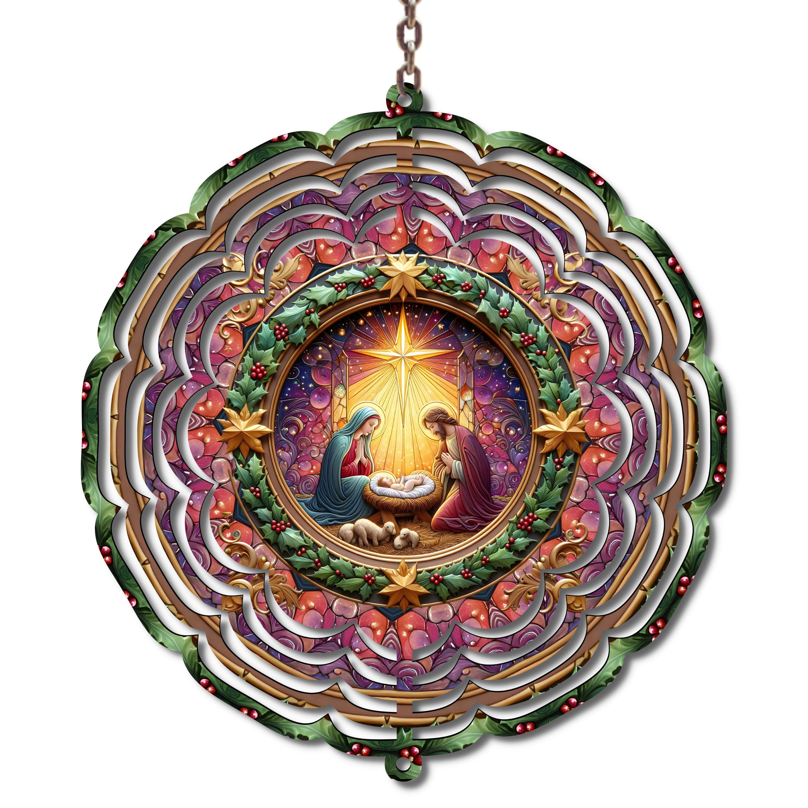 Celebrate the true meaning of Christmas with this stunning 10-inch Nativity Metal Wind Spinner, featuring a beautifully detailed scene of Mary, Joseph, and Baby Jesus beneath the shining Bethlehem star. This piece brings the warmth and wonder of the season to your home, porch, or garden — glowing with vibrant colors and mesmerizing movement when it spins.