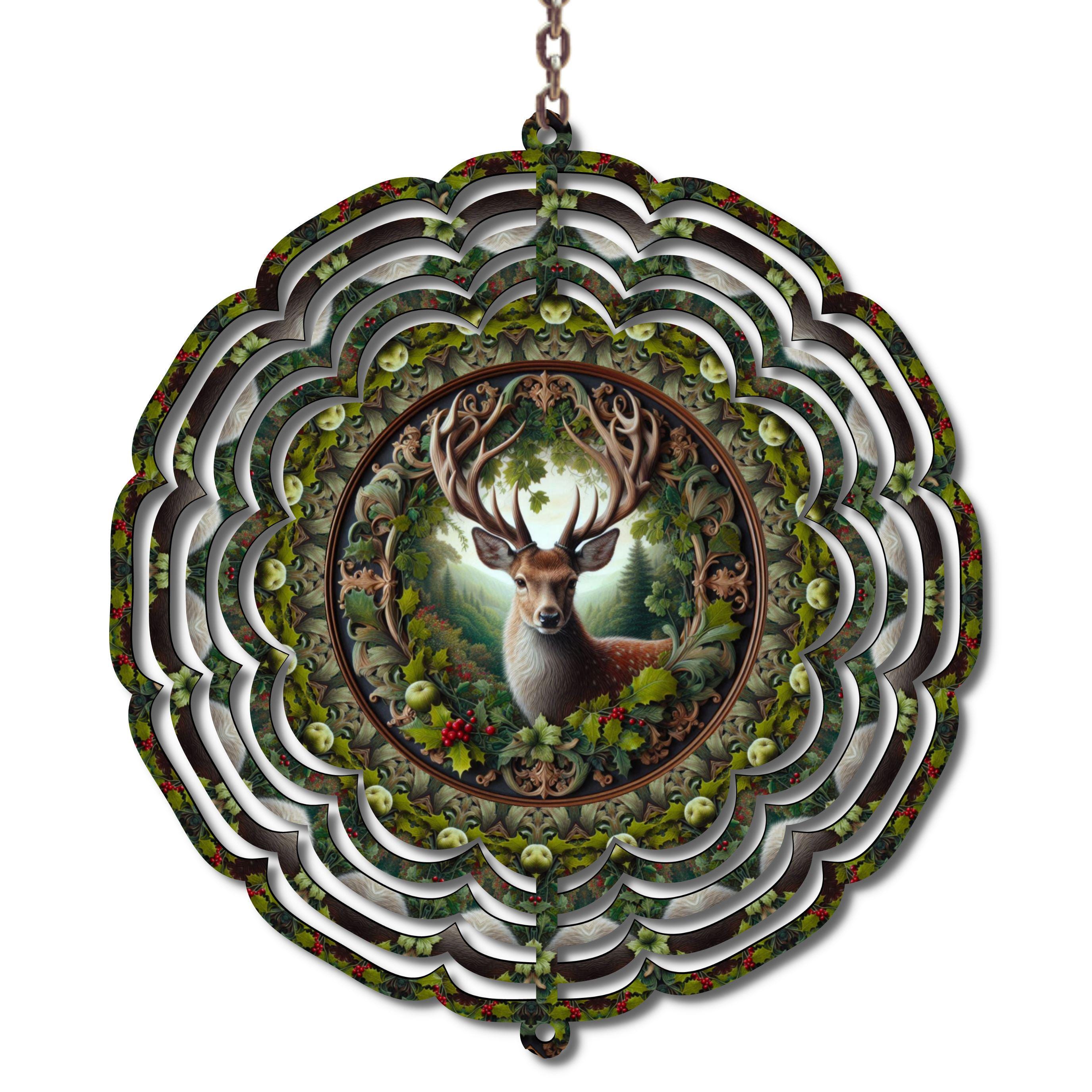 Bring the beauty of the forest to your home with this stunning 10-inch metal wind spinner, featuring an elegant deer surrounded by lush greenery, apples, holly berries, and woodland details. The layered 3D effect creates a mesmerizing spinning motion that catches the light beautifully from every angle.