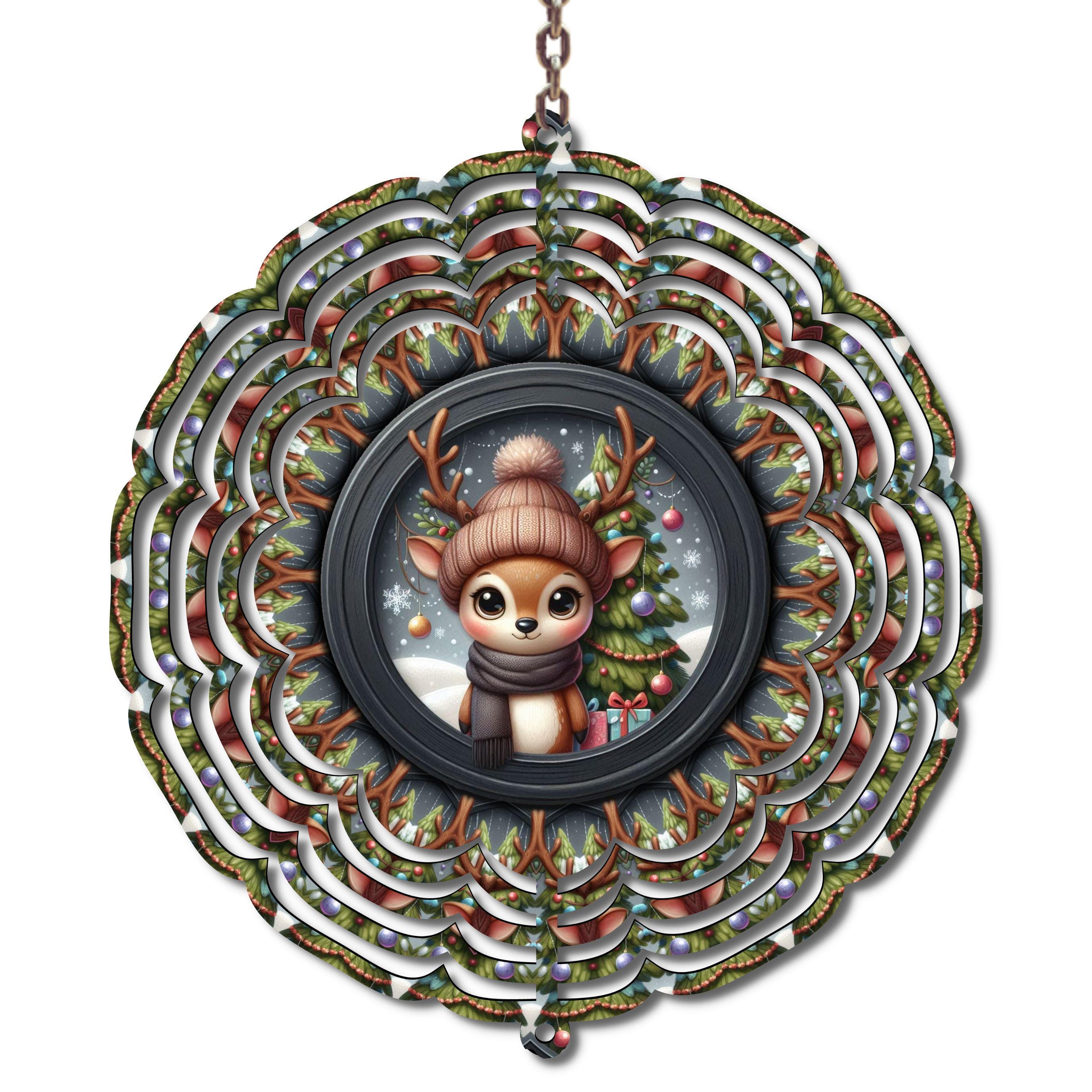 Add cozy Christmas charm to your home with this 10-inch metal wind spinner, featuring an adorable winter deer dressed in a knit hat and scarf, surrounded by snowy trees, ornaments, and presents. The layered 3D design creates a mesmerizing spinning motion that sparkles beautifully in the light.