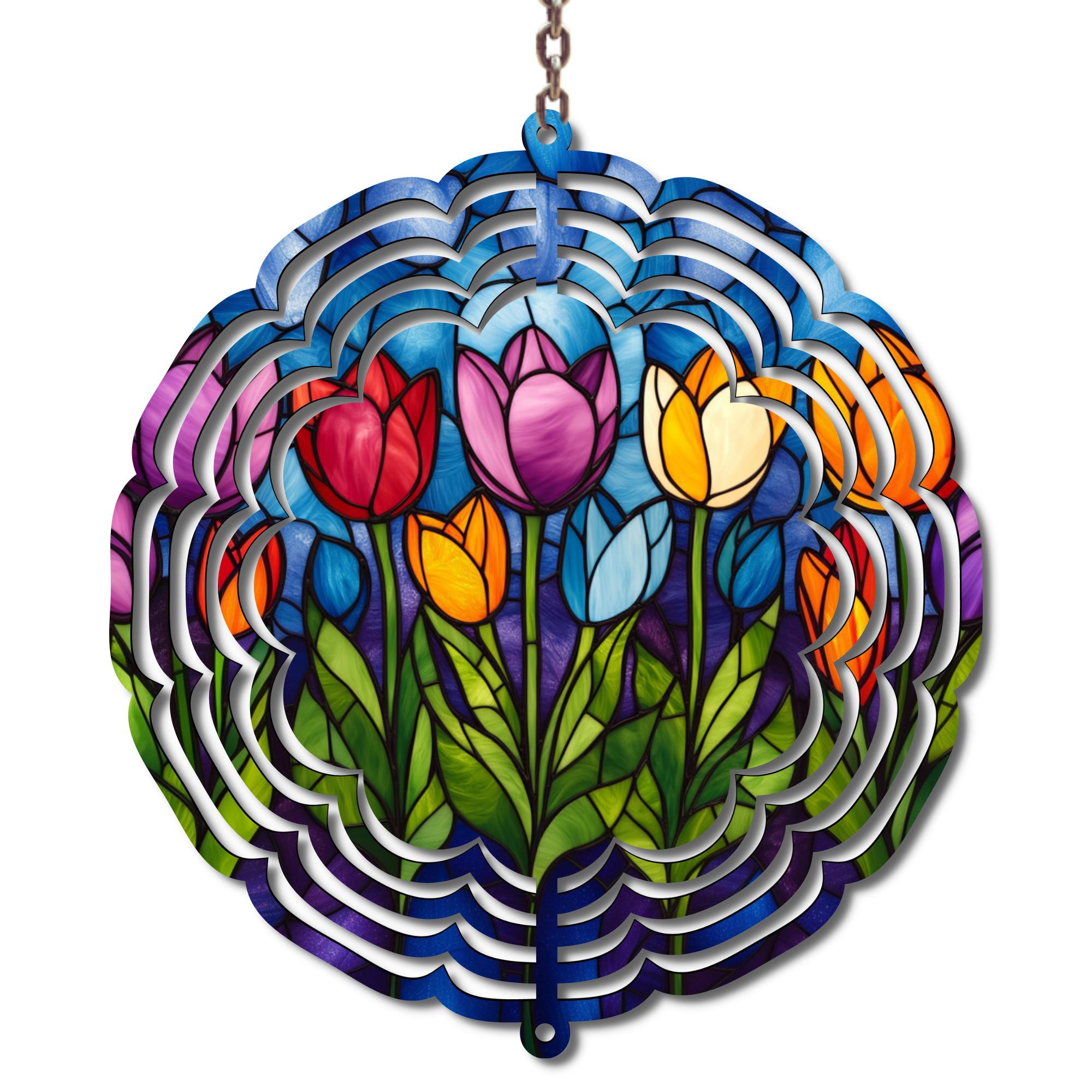 Add a burst of color and elegance to your porch, garden, or indoor space with this Tulip Stained Glass Wind Spinner. Inspired by the look of classic stained glass, this vibrant design features colorful tulips in rich shades of red, pink, purple, yellow, orange, and blue, creating a beautiful floral display that truly comes alive as it spins in the breeze.