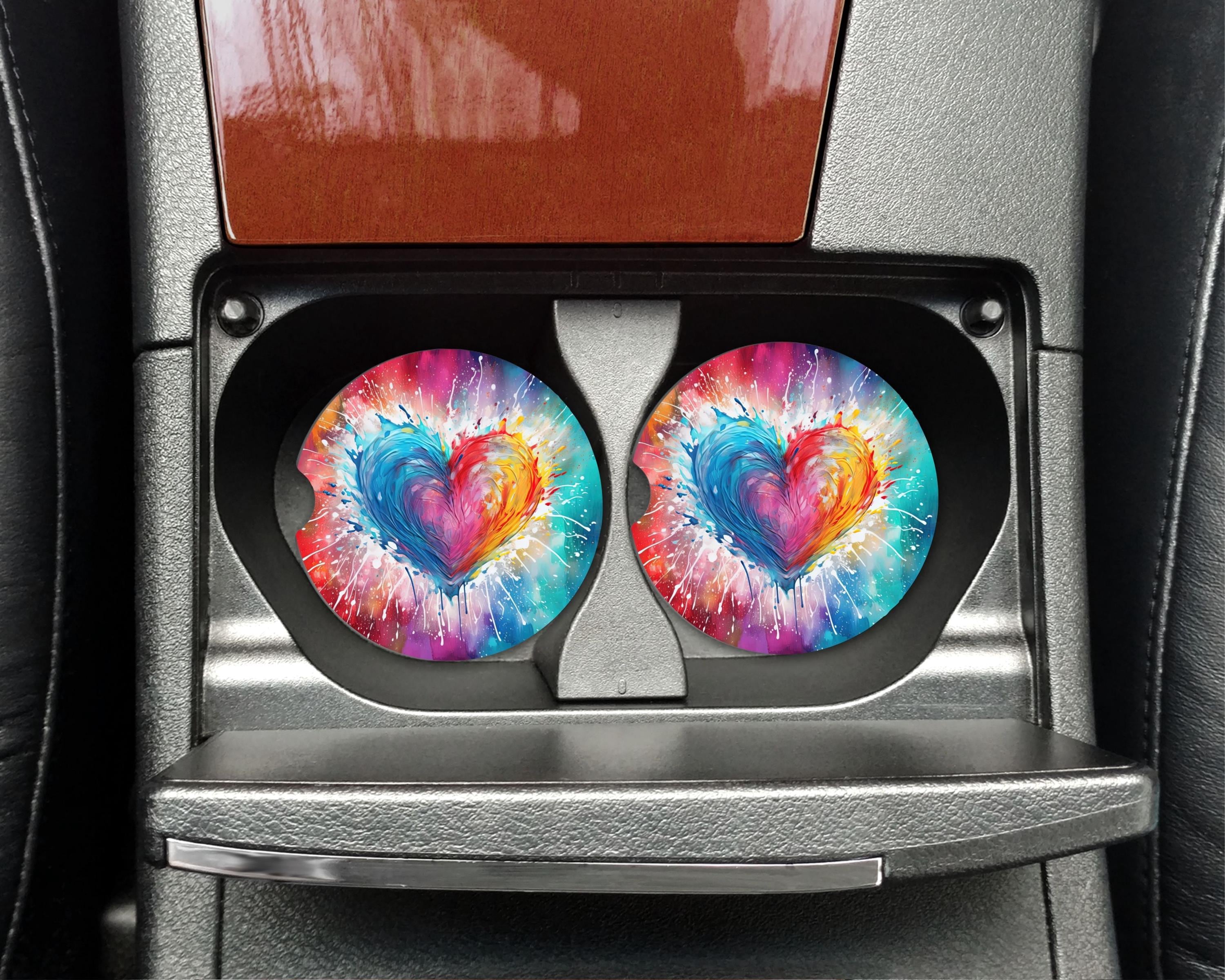 Bring instant joy to your car with this vibrant set of 2 neoprene car coasters featuring a bold rainbow paint-splash heart design. Bright, artsy, and practical—these cup holder inserts help catch drips and keep your console clean while adding a pop of color to every drive.