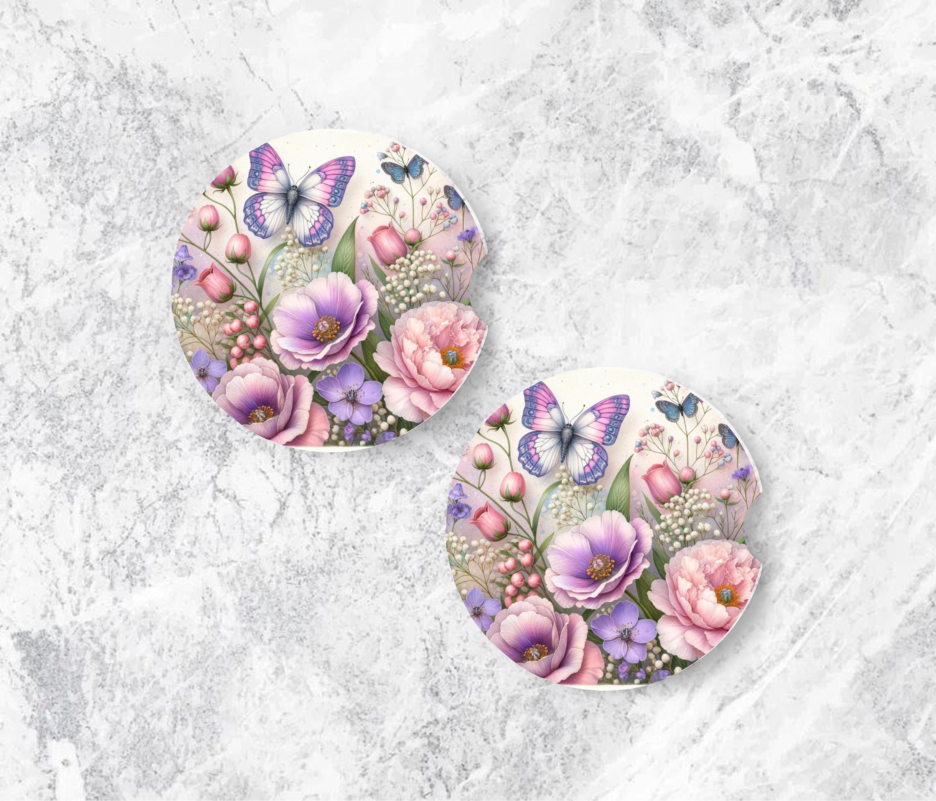 Add a soft, pretty touch to your car with this set of 2 neoprene car coasters featuring a delicate butterfly + floral design in pinks, purples, and pastels. These coasters sit right inside your vehicle’s cup holders to help catch condensation, drips, and spills, keeping your car cleaner while adding a little everyday beauty.