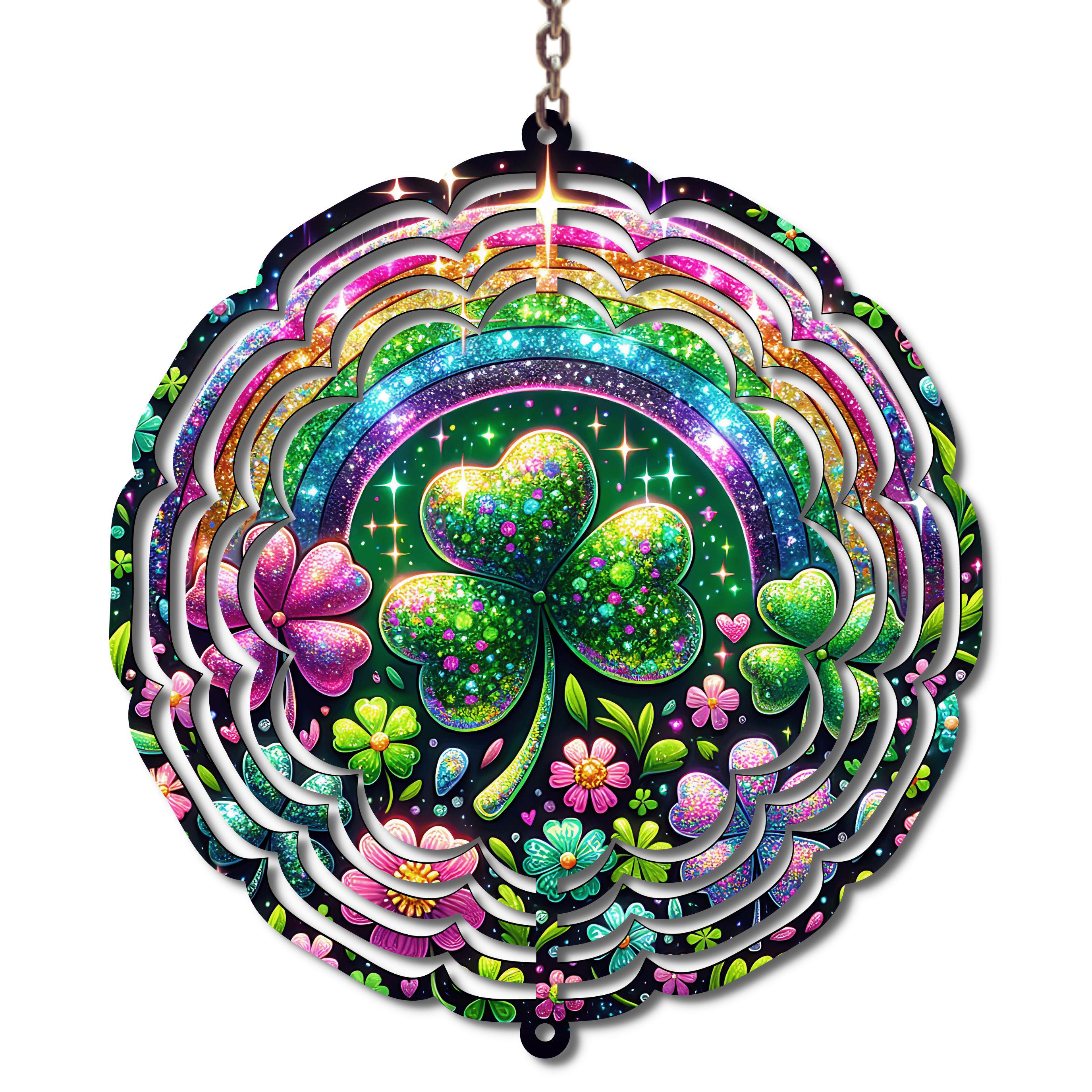 Bring a burst of luck and color to your porch, patio, or garden with this dazzling St. Patrick’s Day shamrock wind spinner! Featuring a bold glittery shamrock surrounded by sparkling rainbow arcs and whimsical flowers, this 10-inch metal wind spinner spins beautifully in the breeze—catching light and adding festive charm wherever it hangs.