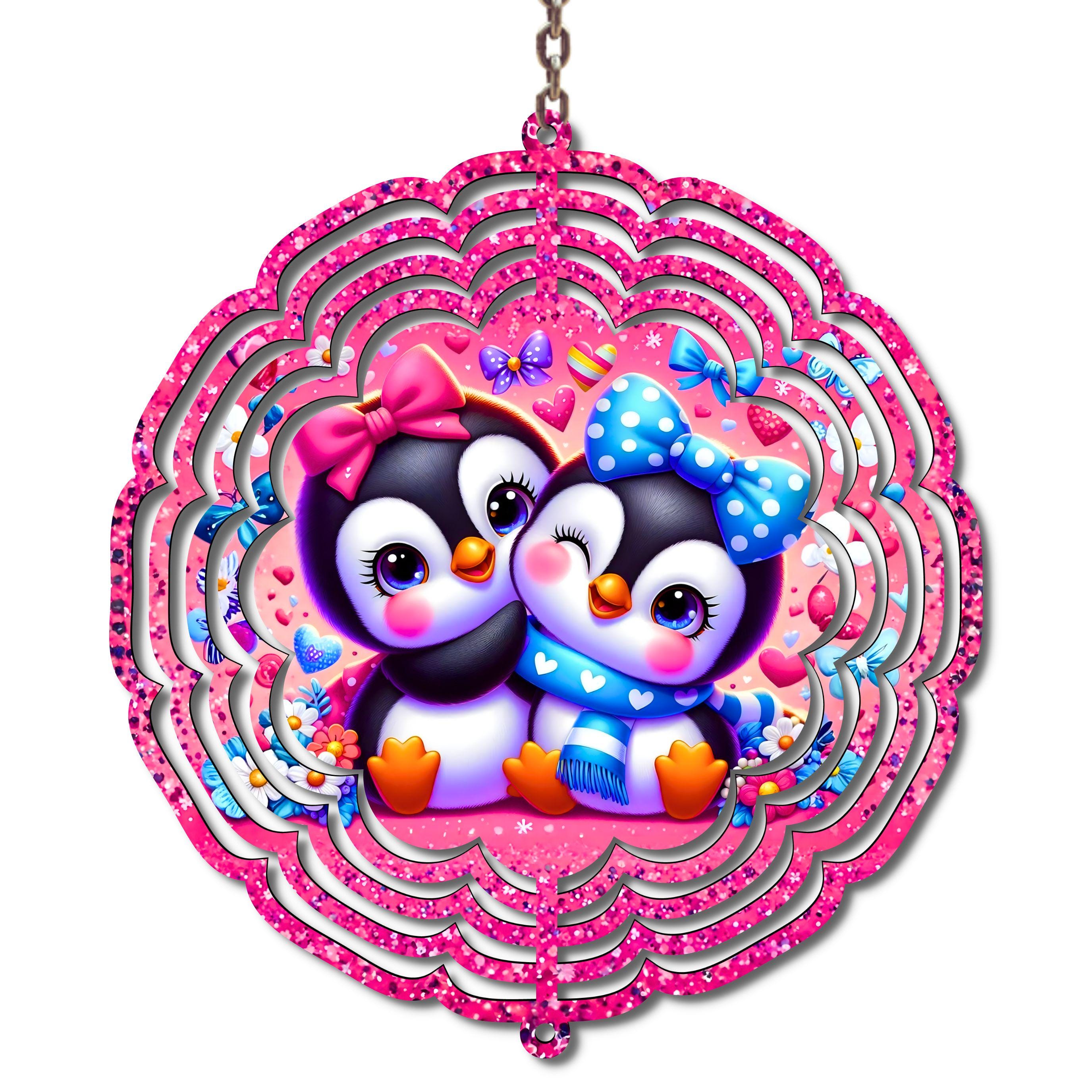 Add a touch of sweet charm to your outdoor space with this adorable pink penguin wind spinner! Featuring two lovable penguins snuggled up with colorful bows, hearts, butterflies, and flowers, this vibrant 3D metal spinner is full of joy and whimsy. With a bright pink background and glittery accents, it’s perfect for Valentine’s Day, anniversaries, birthdays—or just to celebrate love all year long!