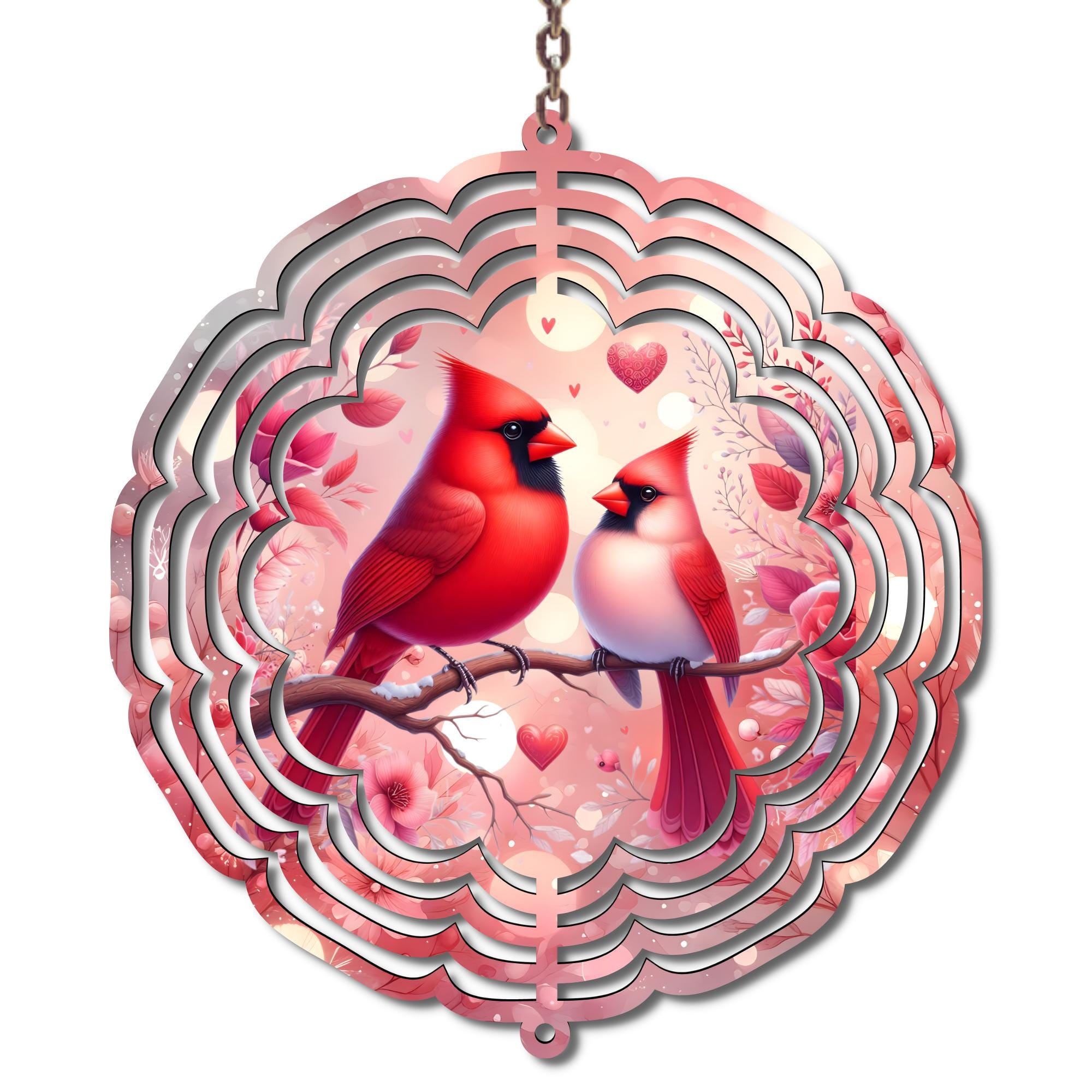 Add a little love to your porch, patio, or garden with this Valentine’s Day wind spinner featuring two bright red cardinals perched together on a branch, surrounded by soft pink florals and sweet heart accents. The layered, flower-style spinner design catches the breeze and creates a beautiful 3D effect as it turns, making it a charming statement piece for winter through Valentine’s Day.