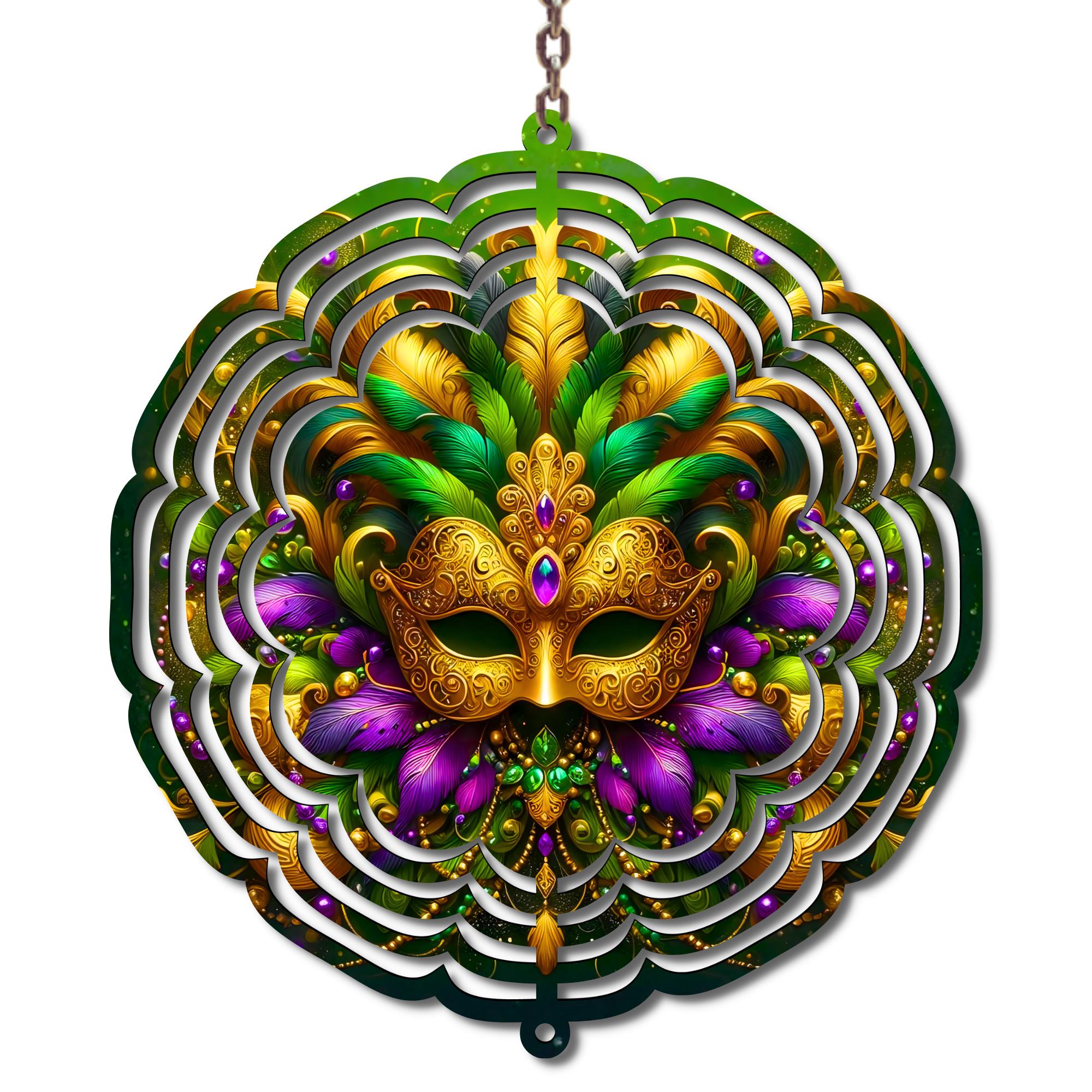 Bring the party outside with this bold Mardi Gras wind spinner featuring an ornate gold masquerade mask surrounded by vibrant purple, green, and gold feathers, jewel accents, and festive sparkle. The layered 3D design creates a mesmerizing effect as it catches the breeze, making it perfect for porch decorating, patio vibes, and Mardi Gras season yard art.