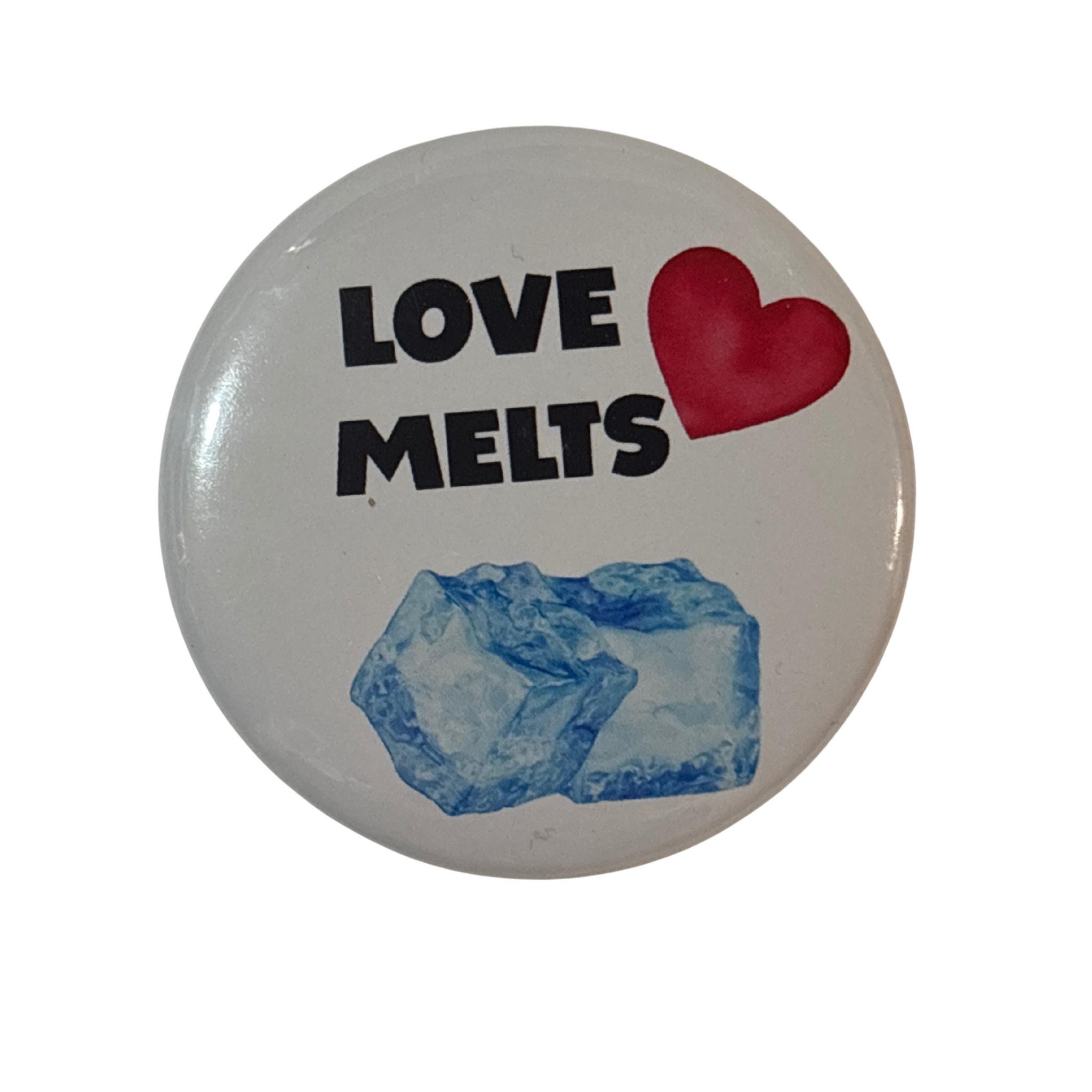 This 2.55-inch pinback button features the phrase “Love Melts” with a heart and ice design. It’s a simple but powerful reminder that compassion, empathy, and humanity can soften even the coldest hearts.