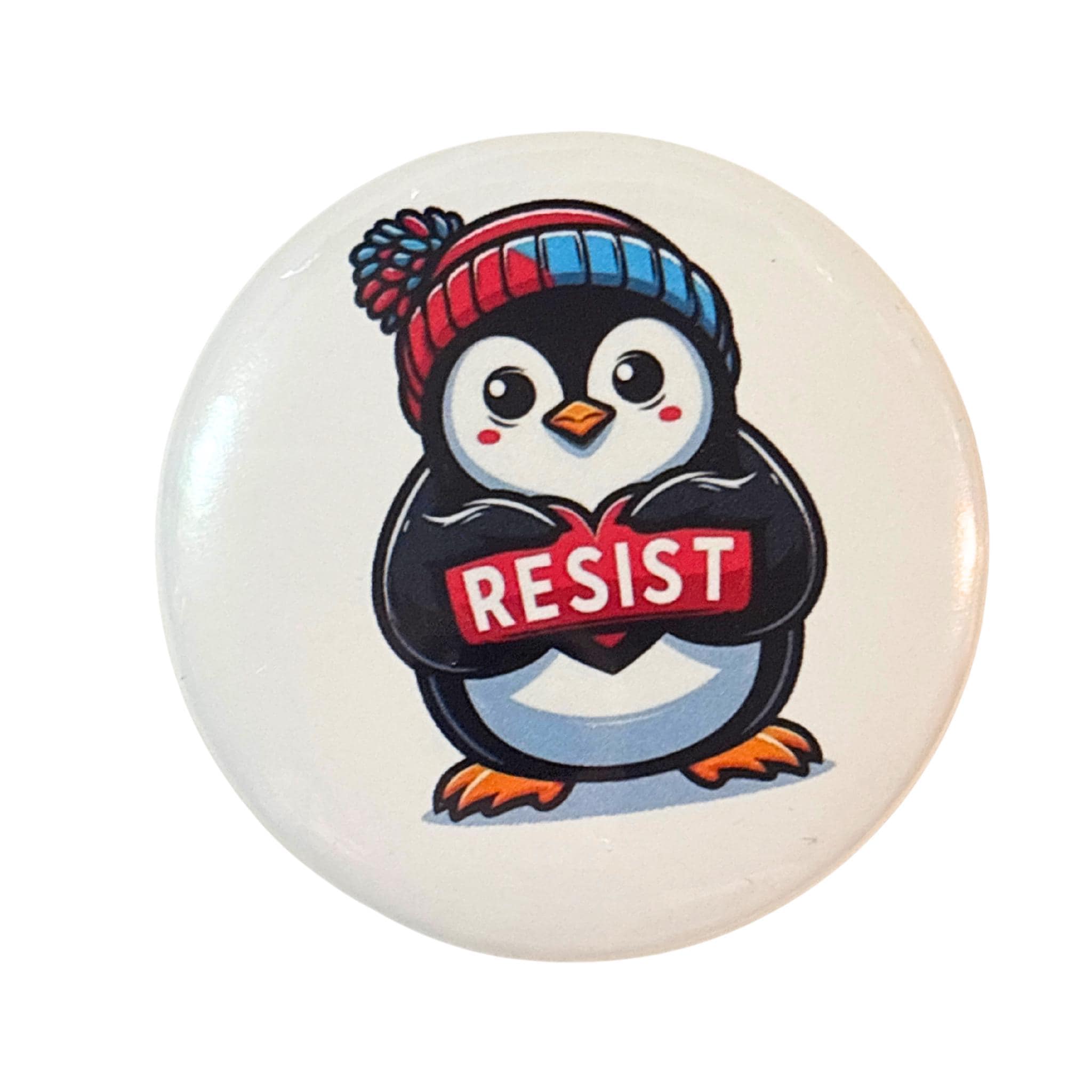 This 2.55-inch pinback button features an illustrated penguin holding a heart with the word “RESIST.”