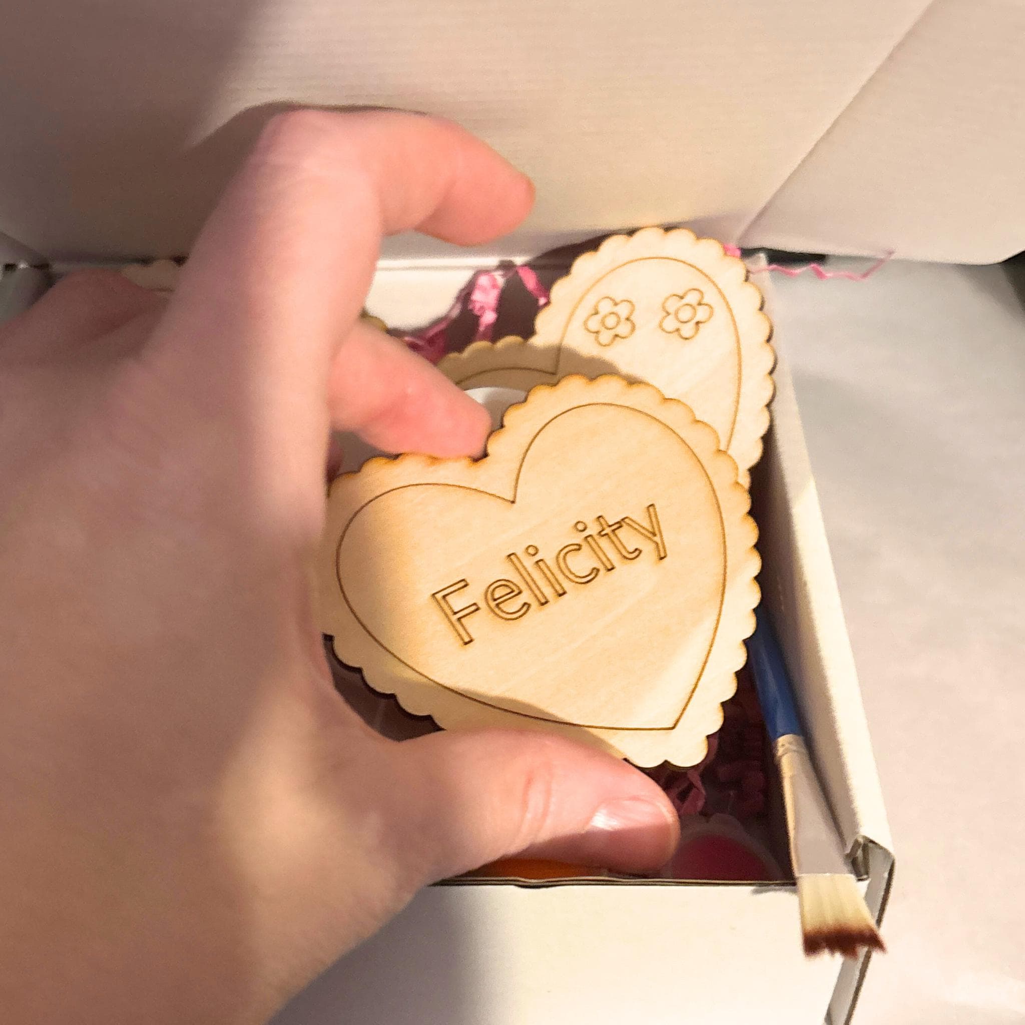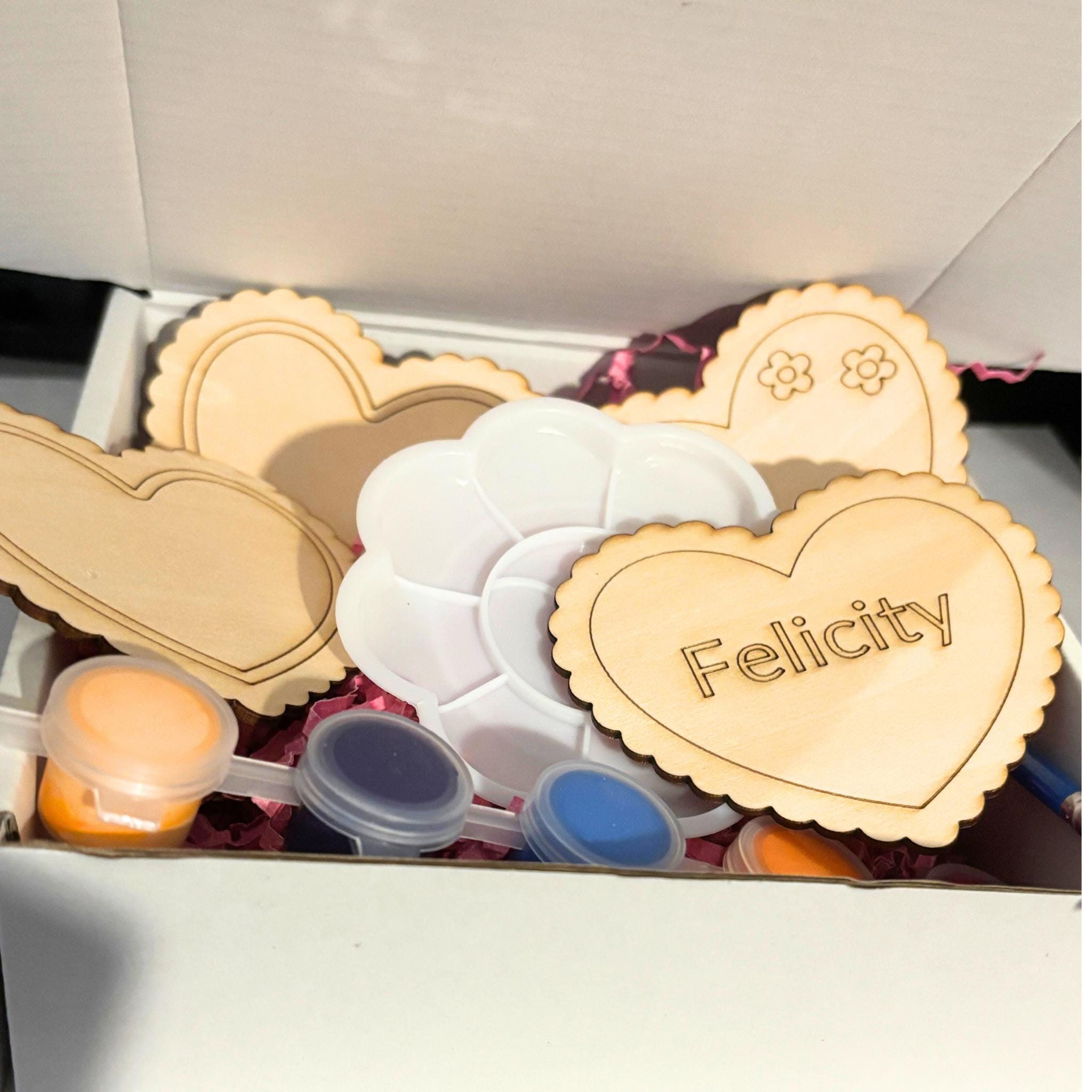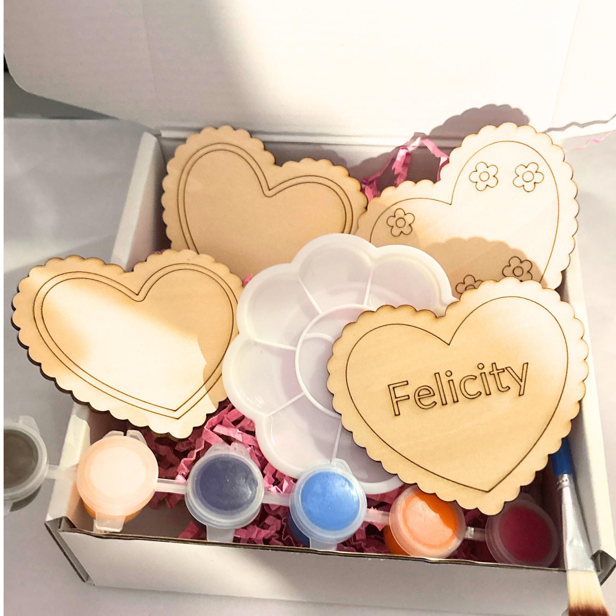This kit includes 4 wooden heart shapes, each measuring approximately 3 inches. One heart is personalized with a name of your choice, making it a meaningful keepsake that kids will love creating and displaying.