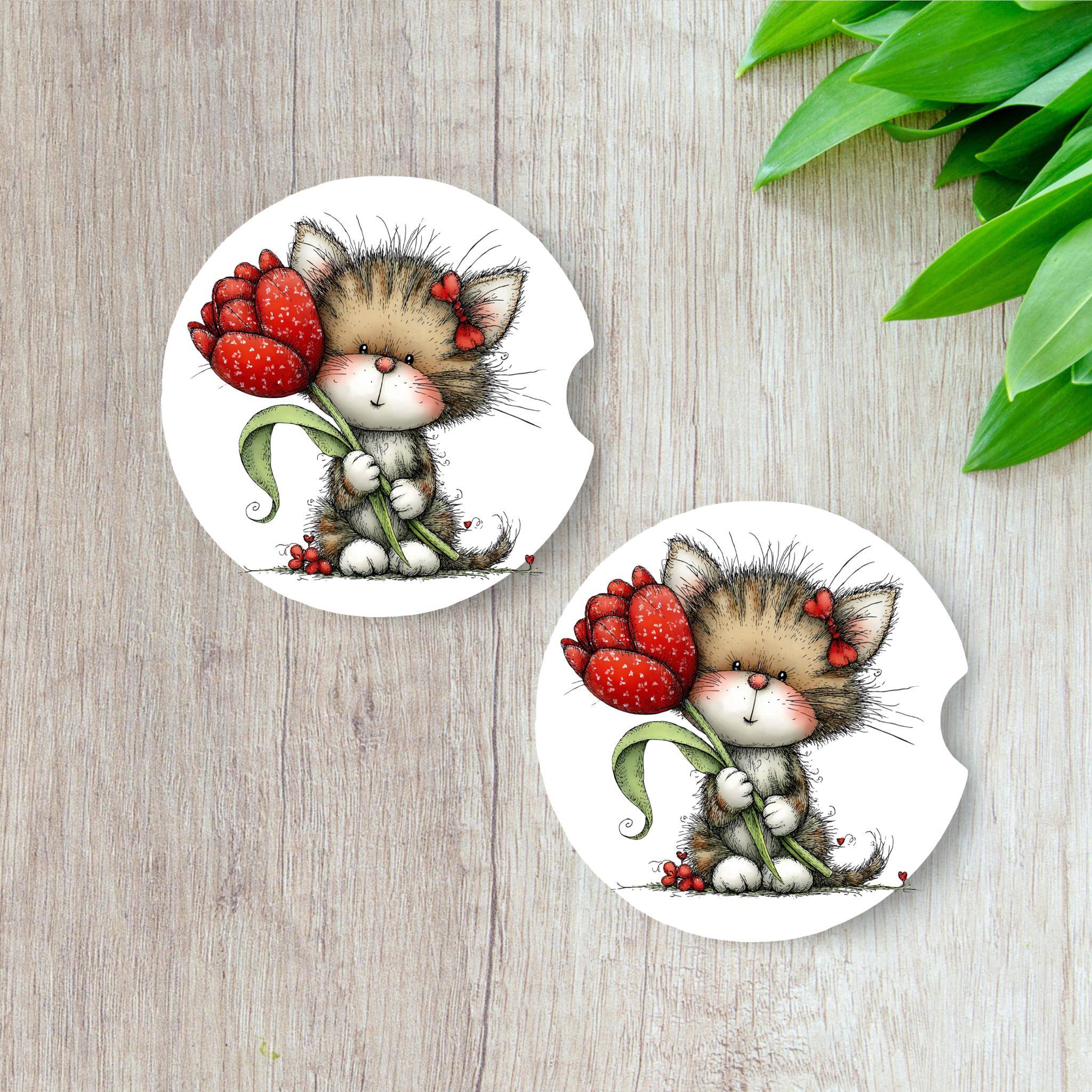 Add a little charm to your car with this set of 2 neoprene car coasters featuring an adorable kitten holding a bright red flower. Soft, whimsical details make these coasters perfect for cat lovers and anyone who enjoys cute, cozy car decor.