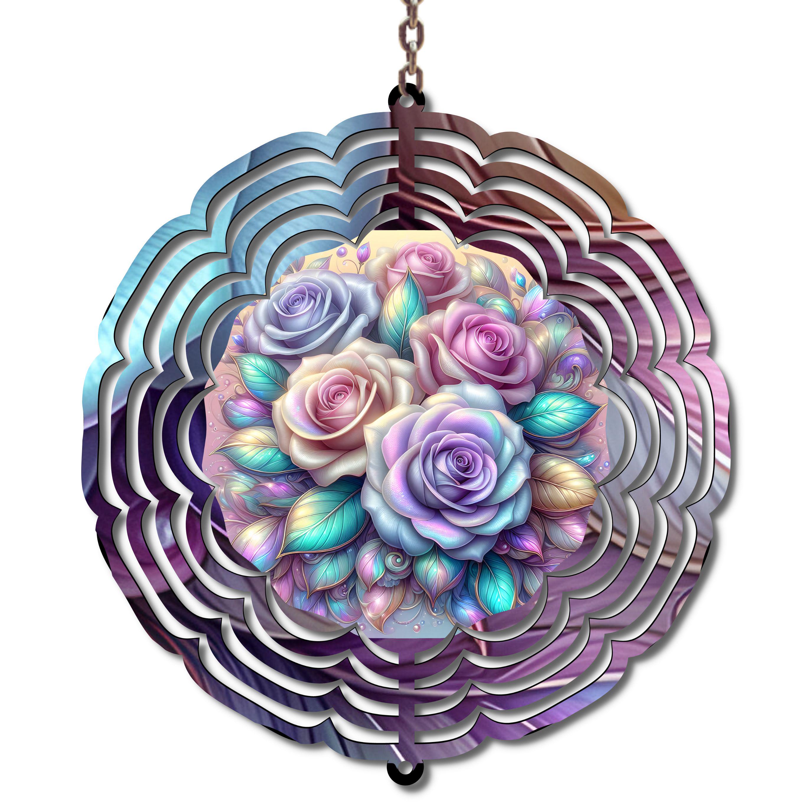 Add a soft pop of color and movement to your garden, porch, or patio with this stunning pastel rose metal wind spinner. Featuring a delicate bouquet of iridescent roses in soft pinks, purples, blues, and creams, this spinner catches the light beautifully as it turns in the breeze.