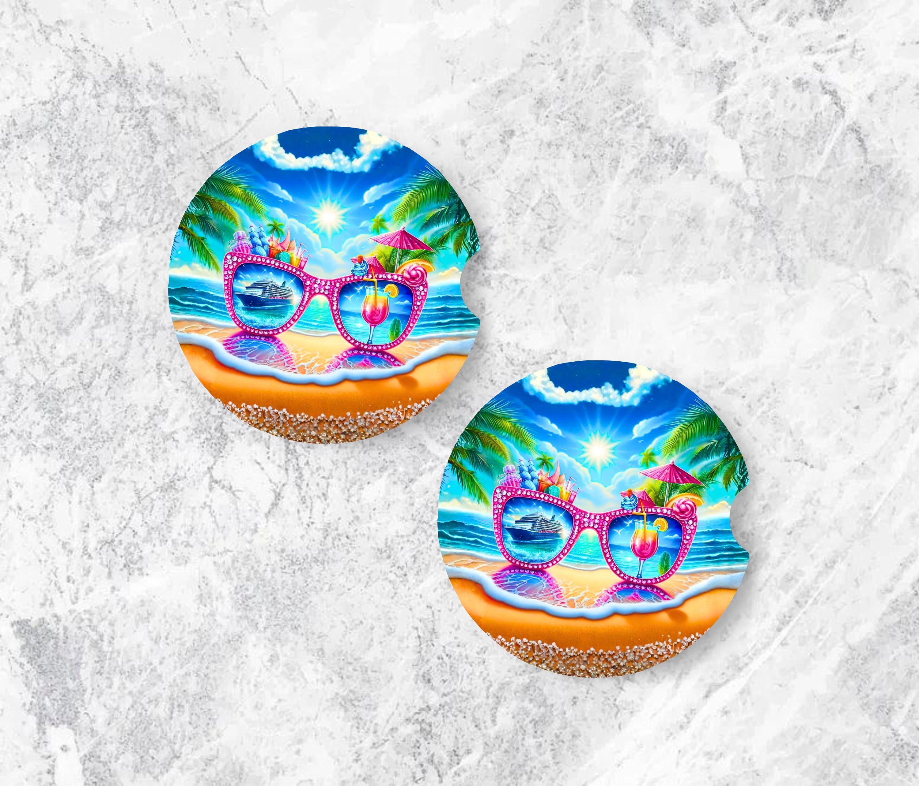 Bring sunny vacation vibes to your drive with these bright and fun beach-themed neoprene car coasters. Featuring colorful sunglasses with a tropical ocean, palm trees, and summer details, these coasters are perfect for anyone who loves the beach, cruises, or warm-weather adventures.