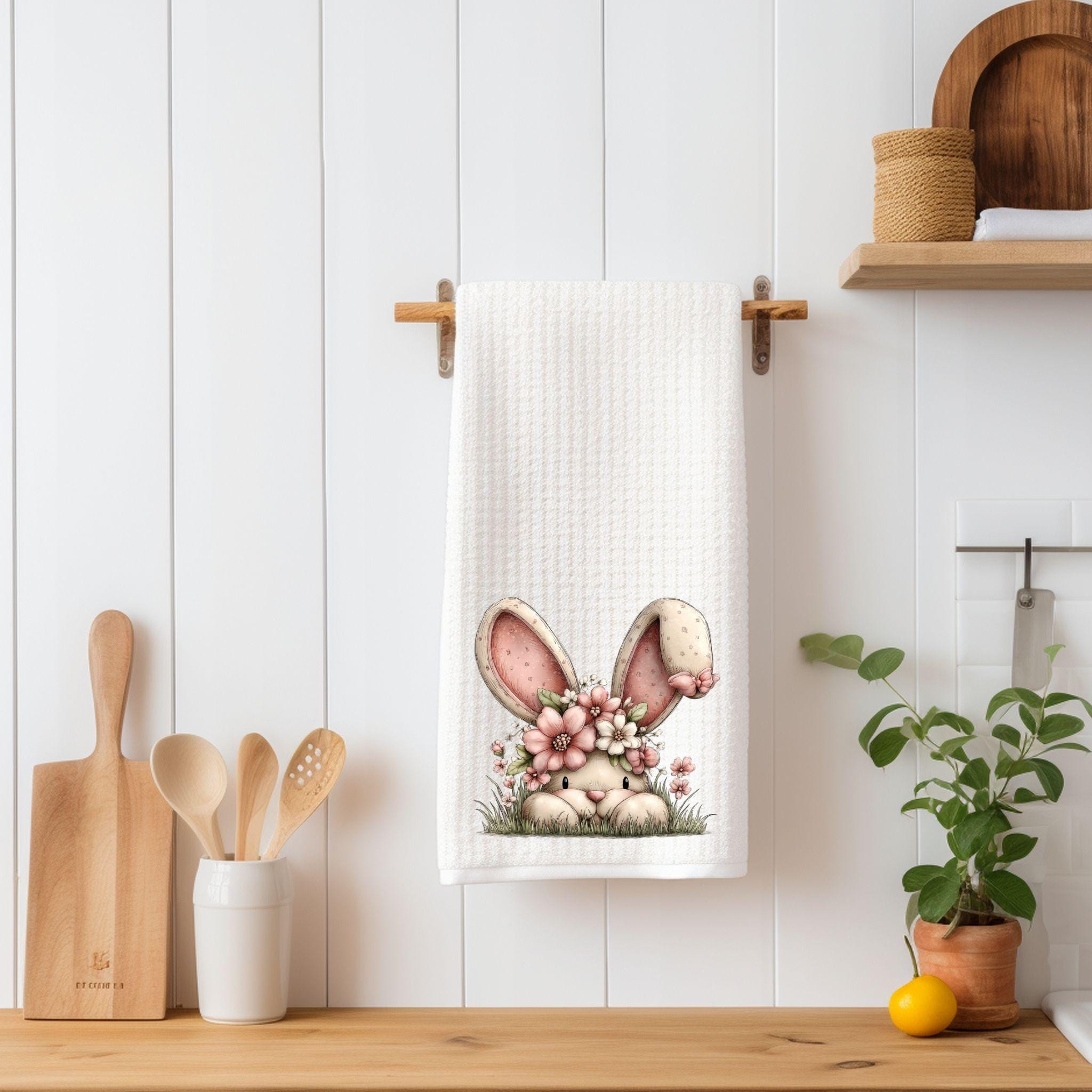 Bring soft spring charm into your kitchen with this beautiful floral bunny waffle towel.