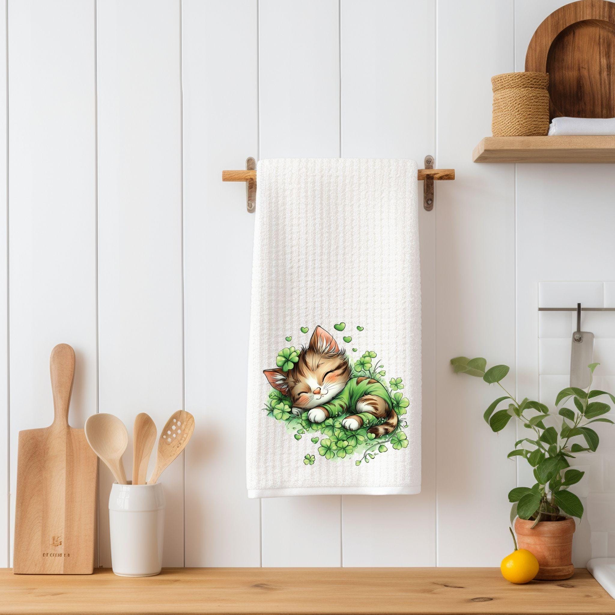 Add a little luck and a lot of cuteness to your kitchen with this adorable shamrock kitty waffle towel.