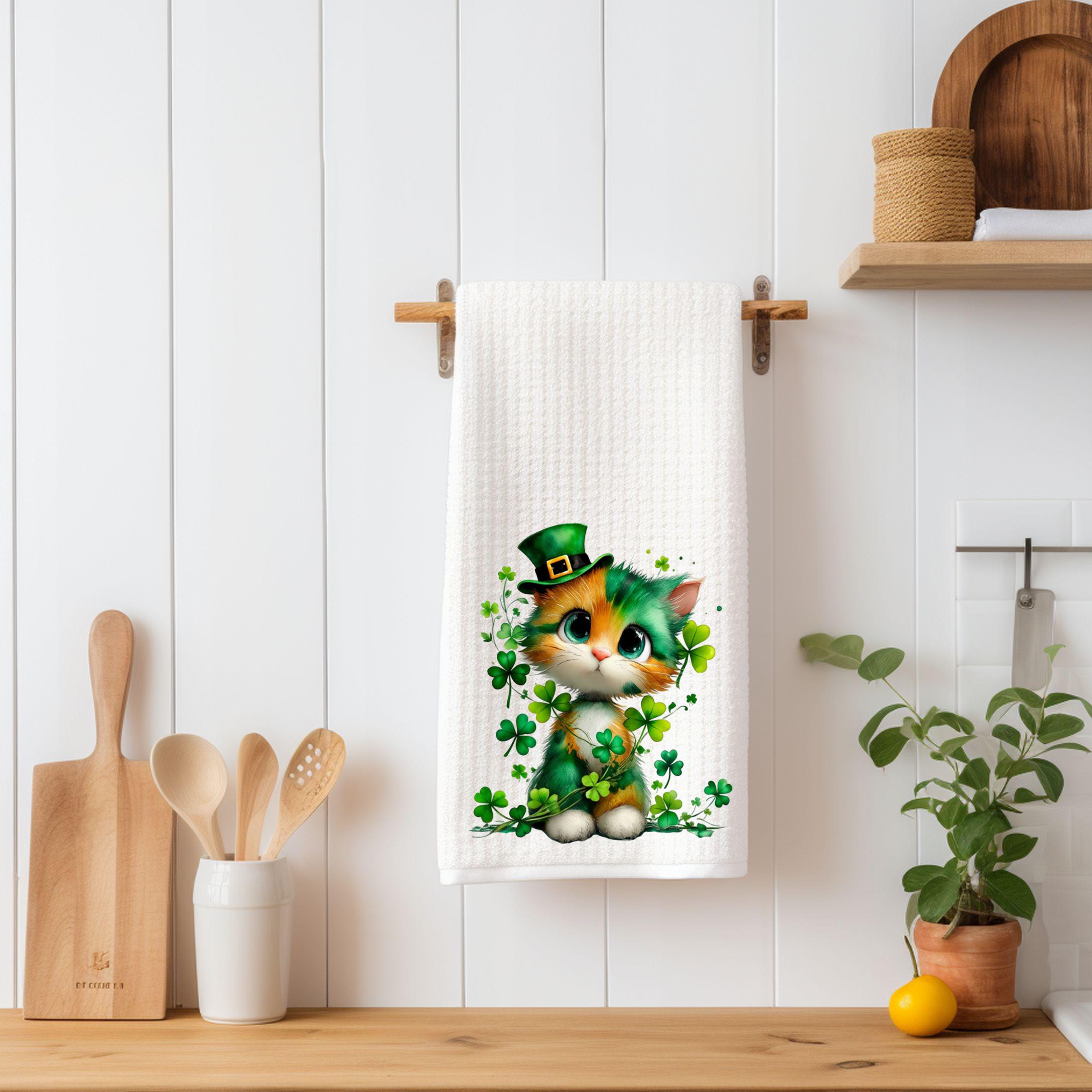This adorable kitchen towel features a sweet little kitten dressed in a leprechaun hat, surrounded by lucky shamrocks. With big expressive eyes and festive green details, this design is perfect for cat lovers who want a cozy touch of Irish charm in their home.
