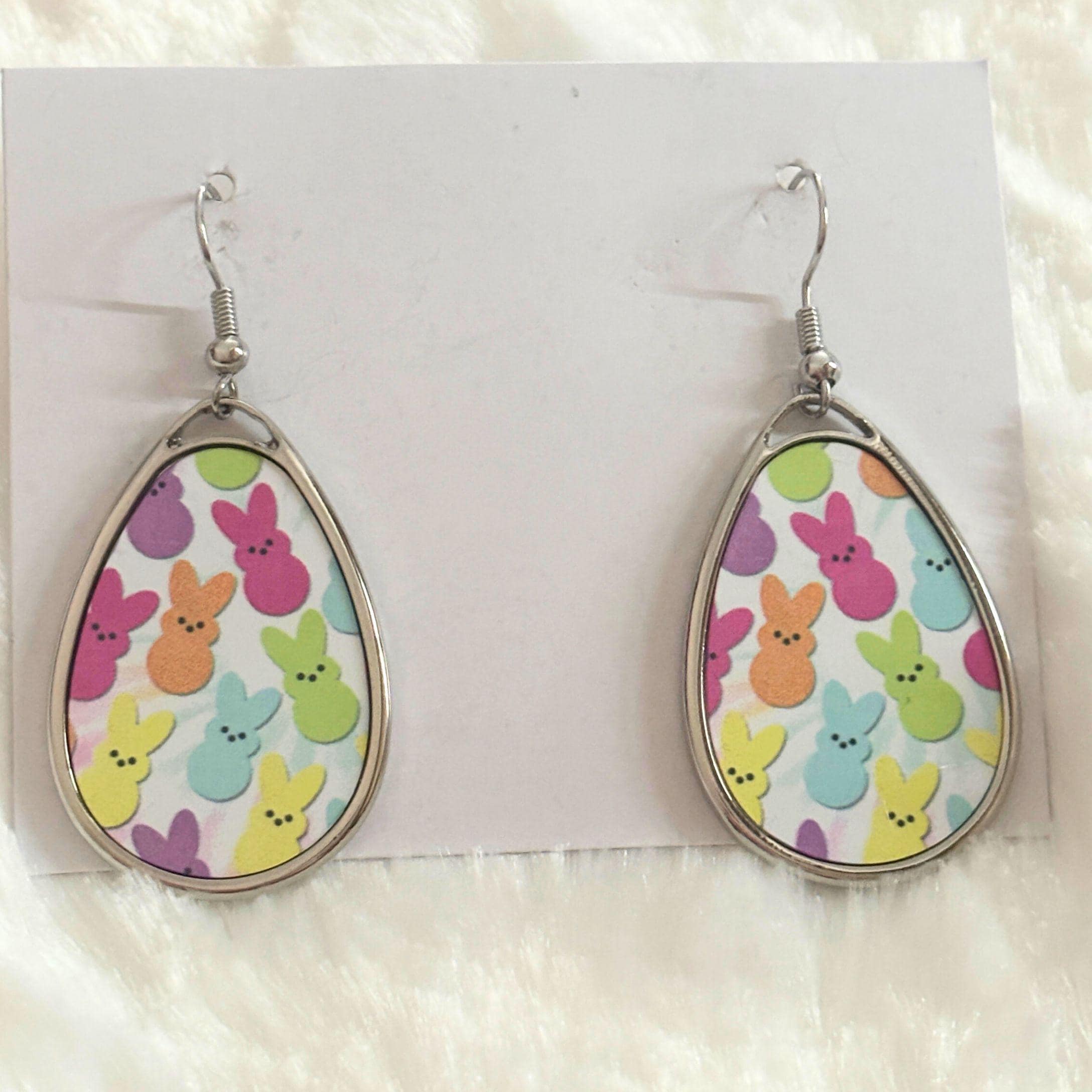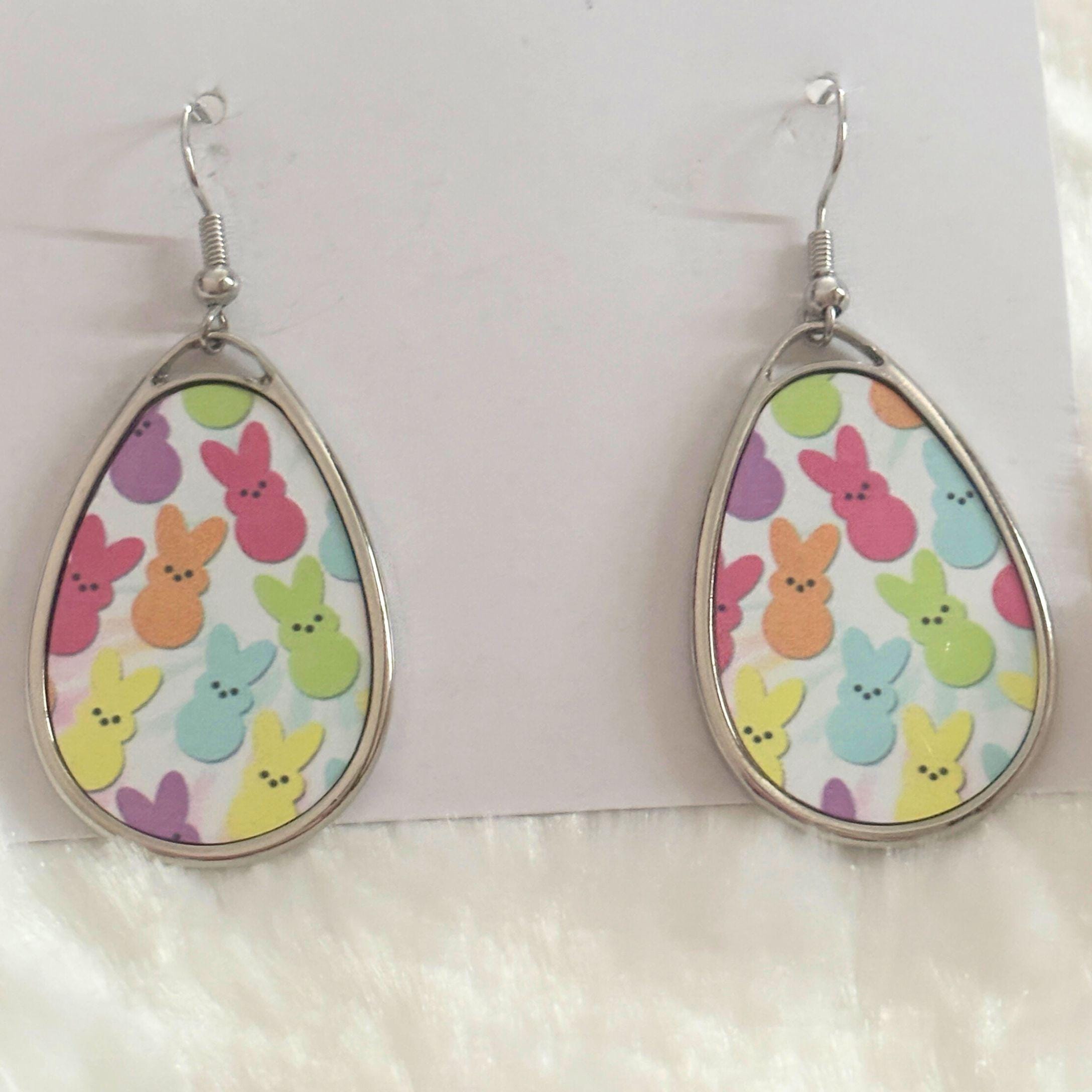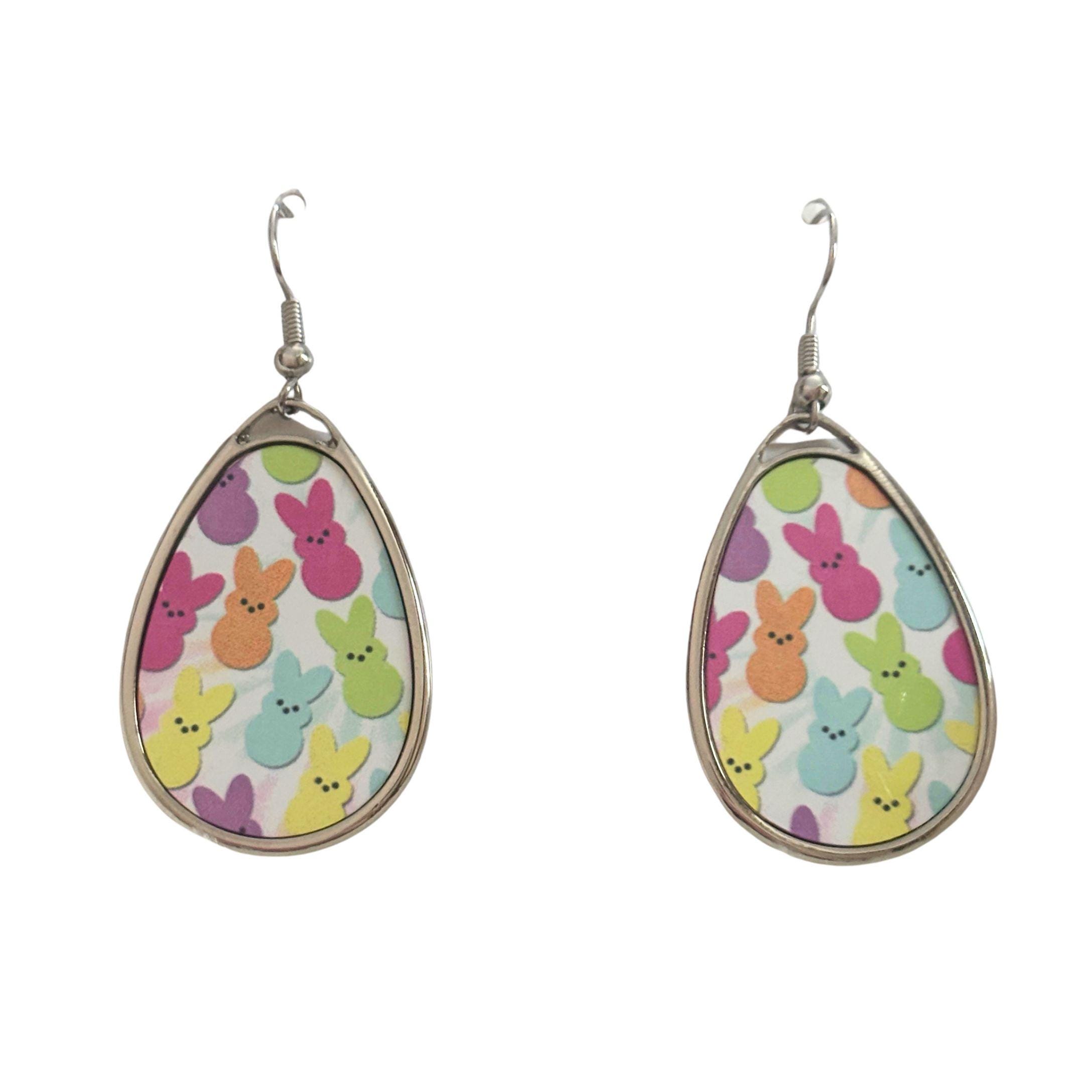 Celebrate spring in the sweetest way with these pastel bunny teardrop earrings. Featuring a playful pattern of colorful Easter-inspired bunnies in soft pink, yellow, purple, blue, and green, these earrings are perfect for adding a cheerful pop to any outfit.
