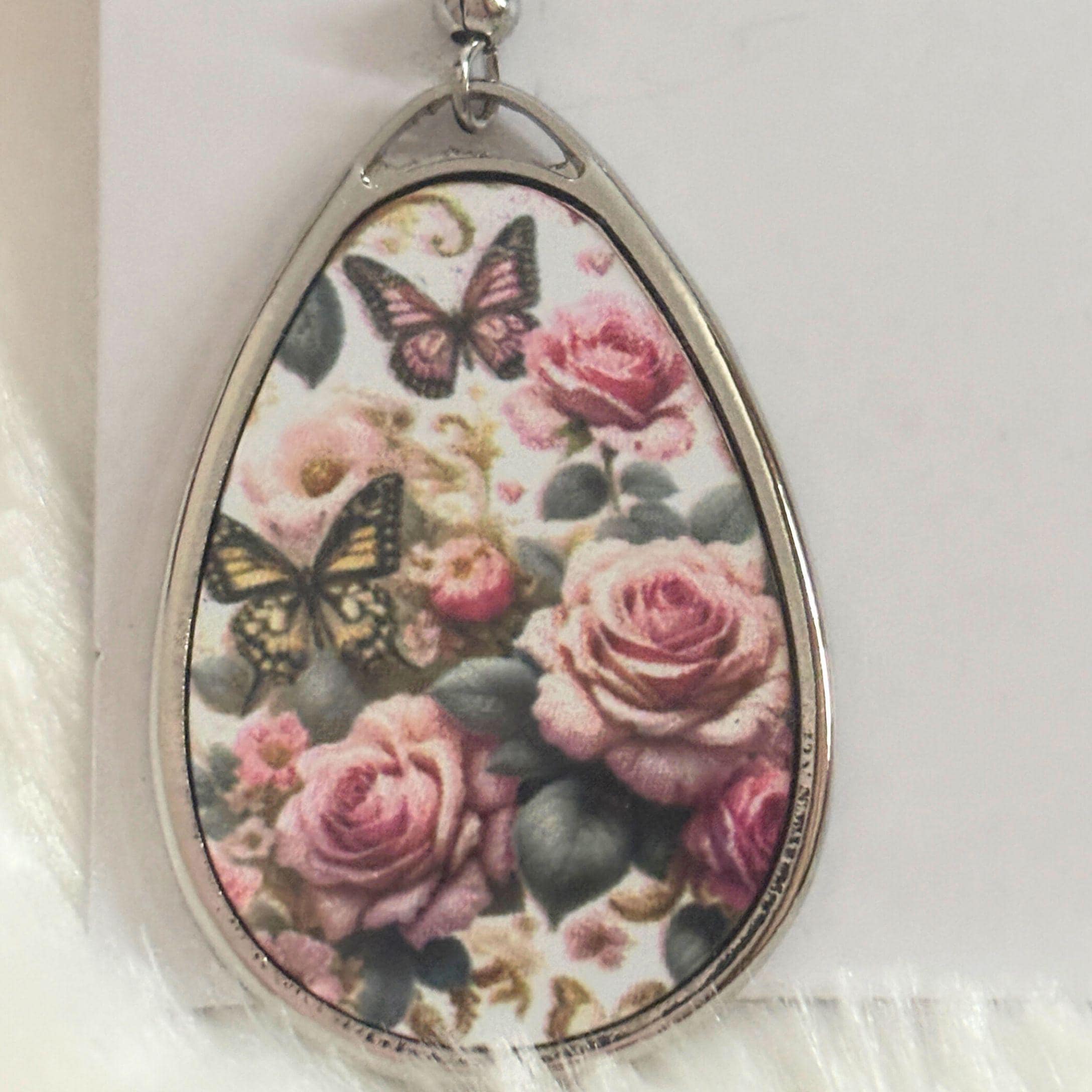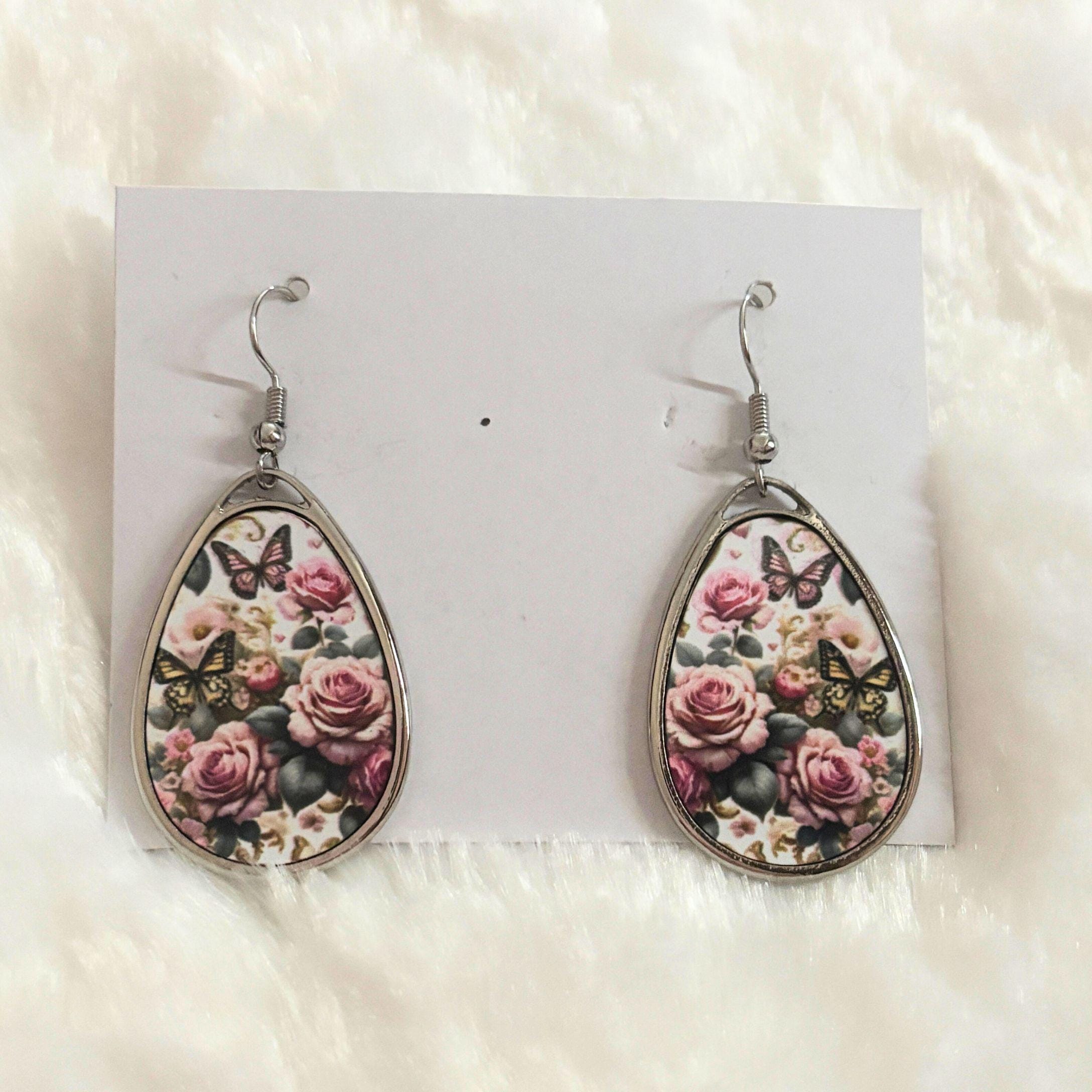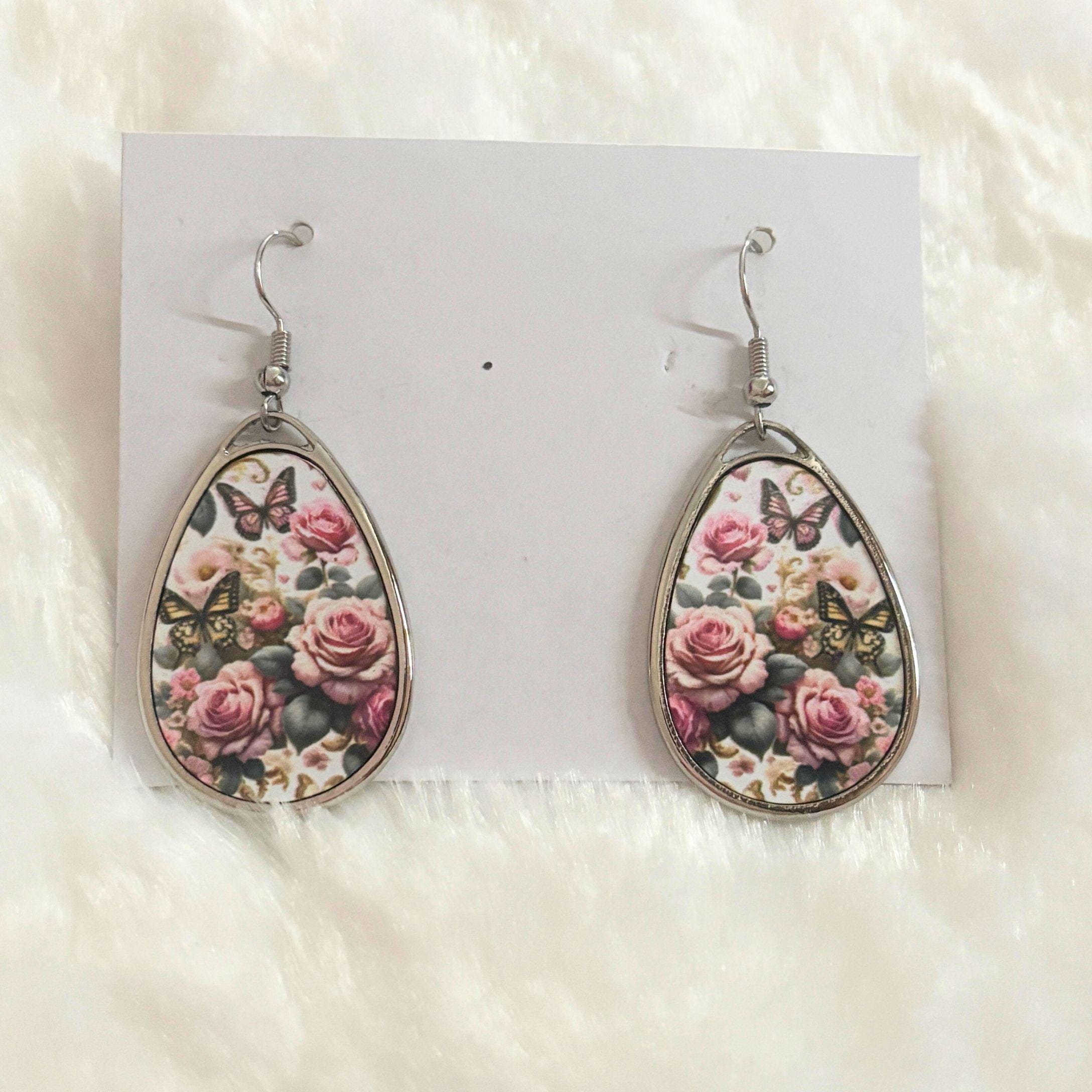 These floral butterfly teardrop earrings bring soft vintage charm to any outfit. Featuring delicate pink roses surrounded by graceful butterflies, the design feels romantic, feminine, and timeless.
