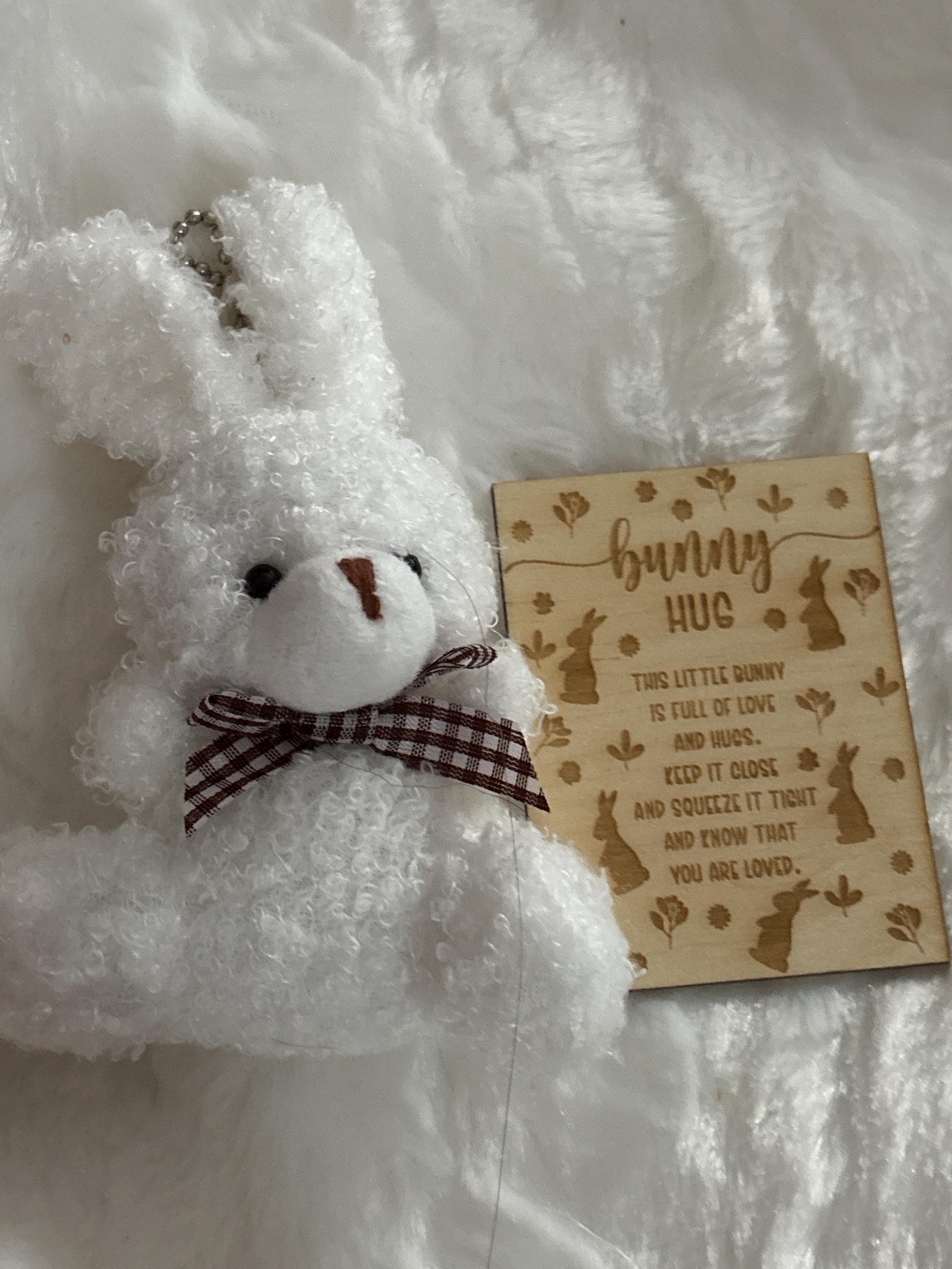 Wooden card is laser engraved with a bunny hug theme and poem