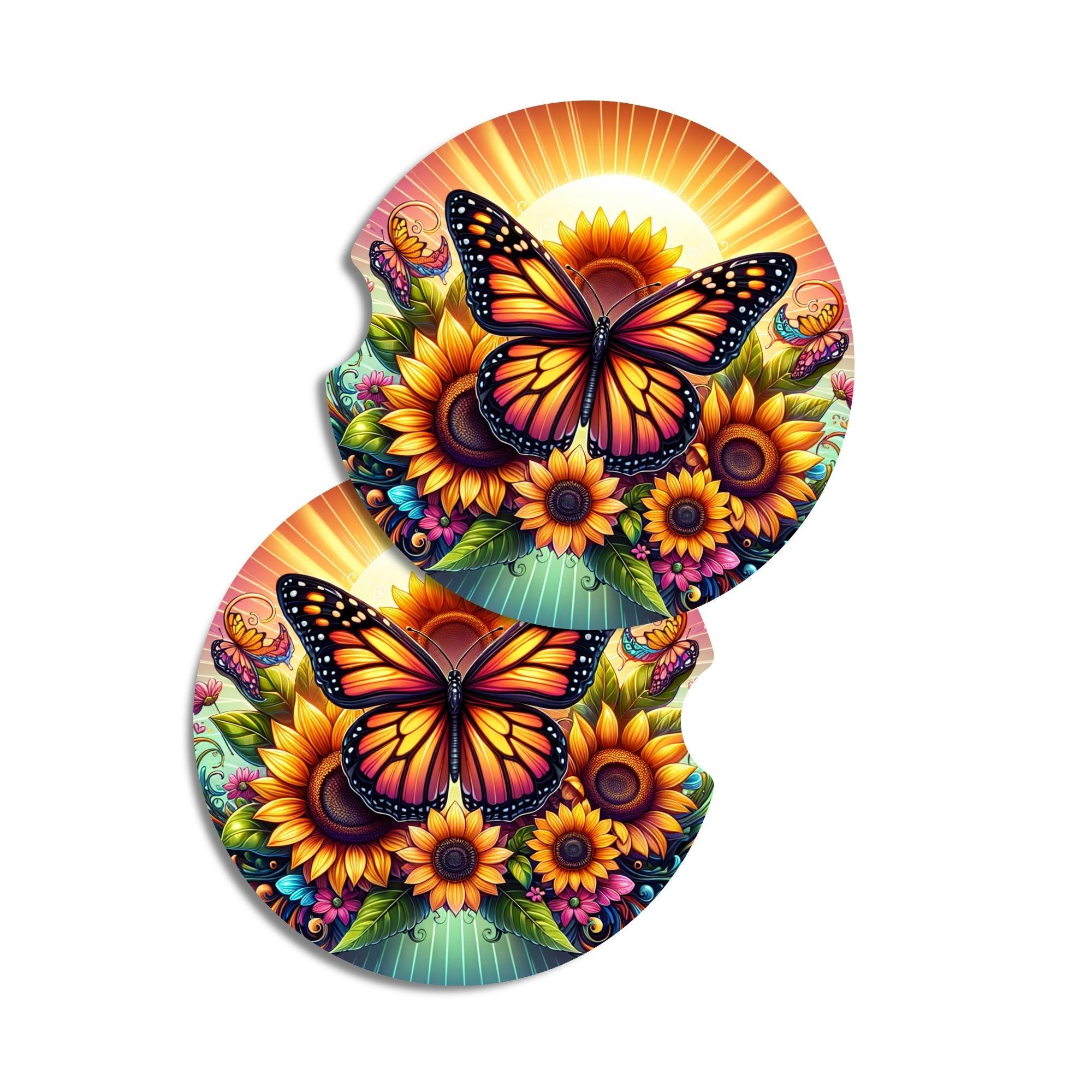 Add a bright and cheerful touch to your vehicle with this beautiful butterfly and sunflower neoprene car coaster set. Featuring vibrant butterflies, glowing sunflowers, and colorful floral details, these coasters are both functional and stylish.