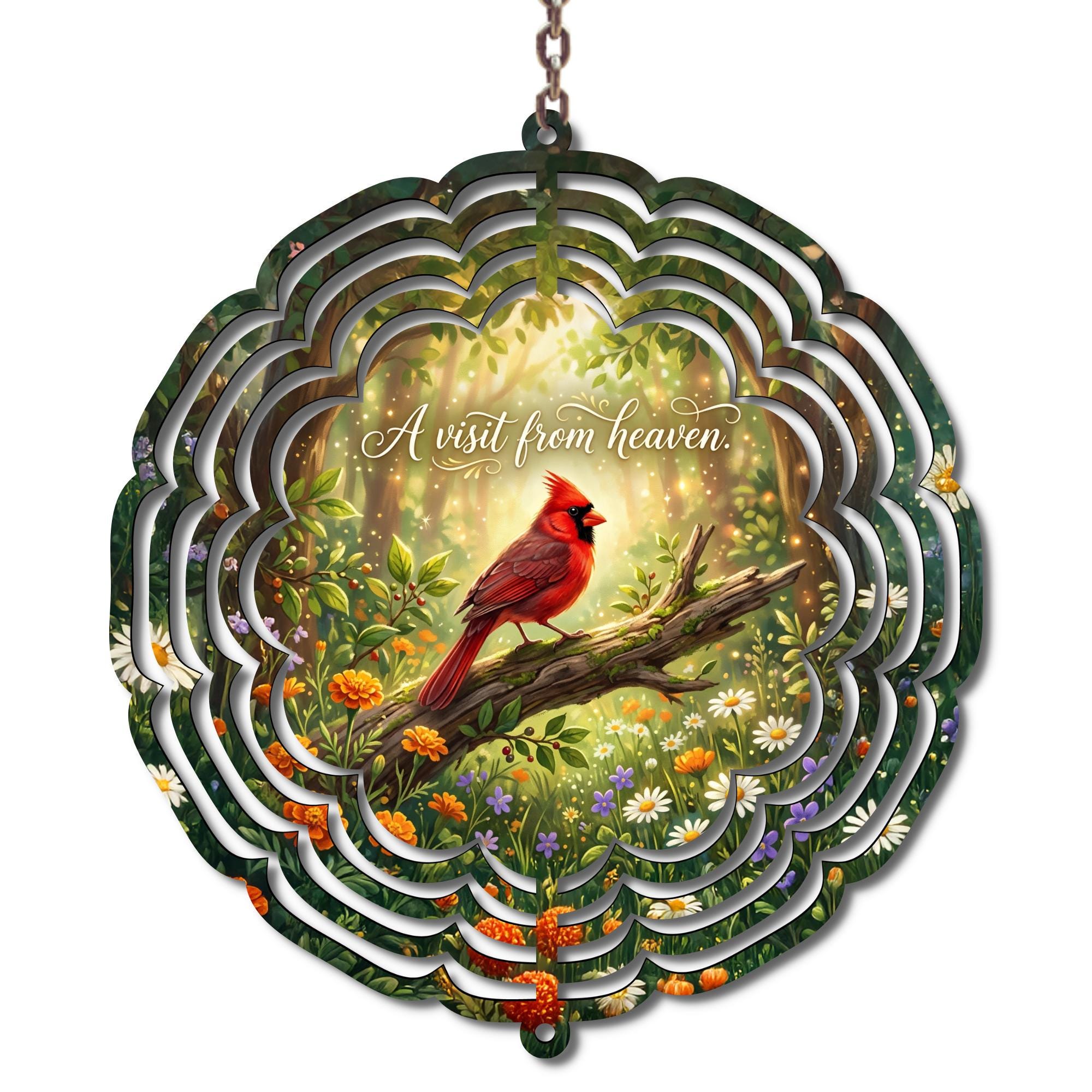 This beautiful cardinal wind spinner features a peaceful woodland scene with a vibrant red cardinal and soft floral accents. Cardinals are often seen as signs from heaven, bringing comfort and reminding us that our loved ones are always near.