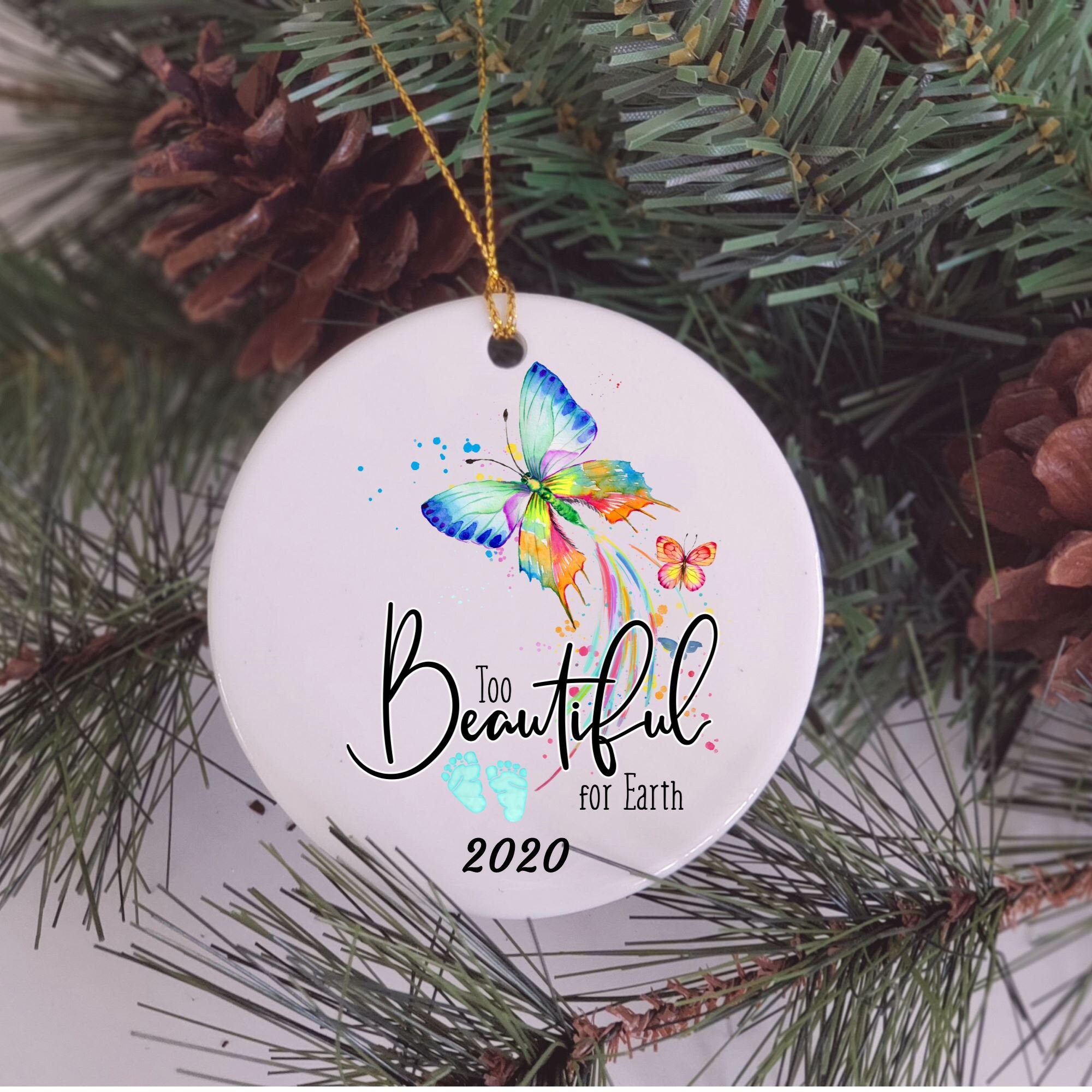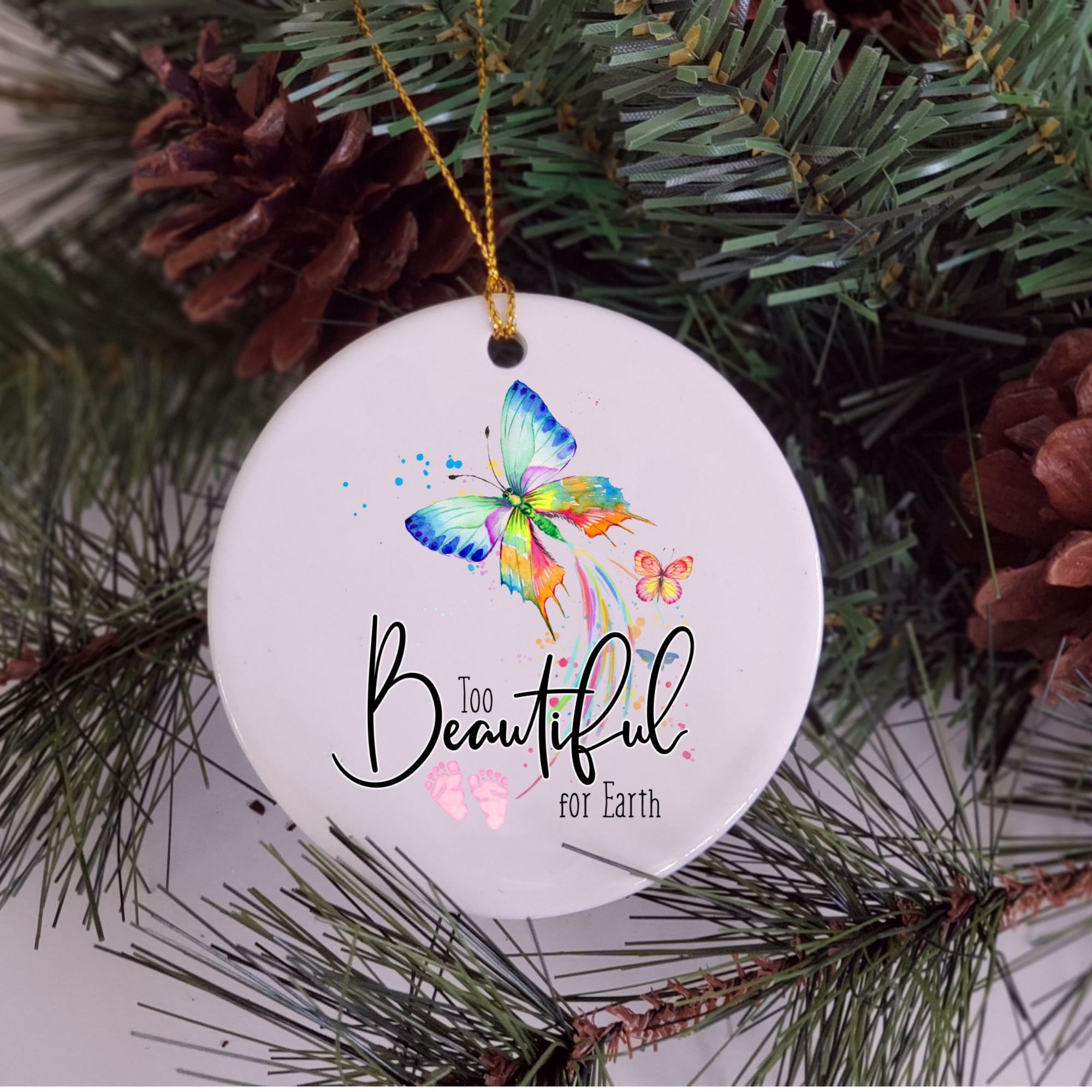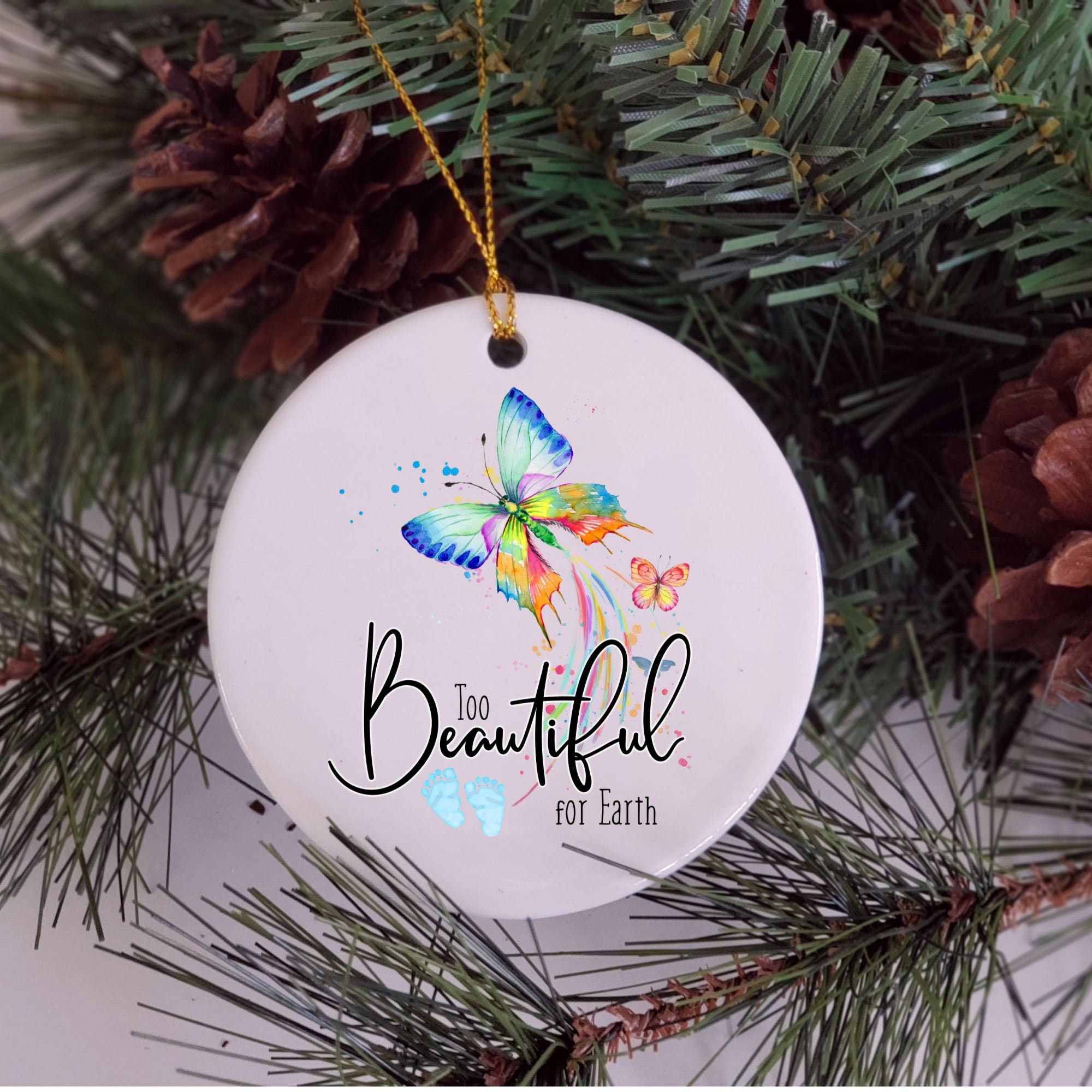 This beautiful 2.75 inch (one-sided) memorial ornament is a great gift for the grieving mom. This butterfly, as if flying from heaven is a beautiful keepsake with the words "Too Beautiful for Earth".